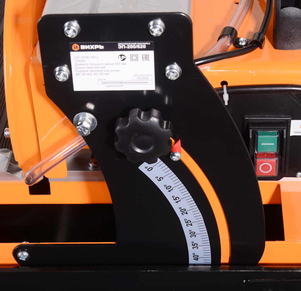 Электрический плиткорез Вихрь ЭП-200/620 с асинхронным мотором мощностью 900 Вт предназначен для строительных и ремонтных работ. Применим для распиливания плитки из керамики под углом 45° и 90°, обработки мраморных, гранитных, стеклянных изделий. Максимальная частота вращения диска равна 2950 об/мин. Это позволяет распиливать изделия значительной толщины. Под углом 90° глубина реза составляет 35 мм, при 45° - 25 мм. Угол и глубина реза регулируются.