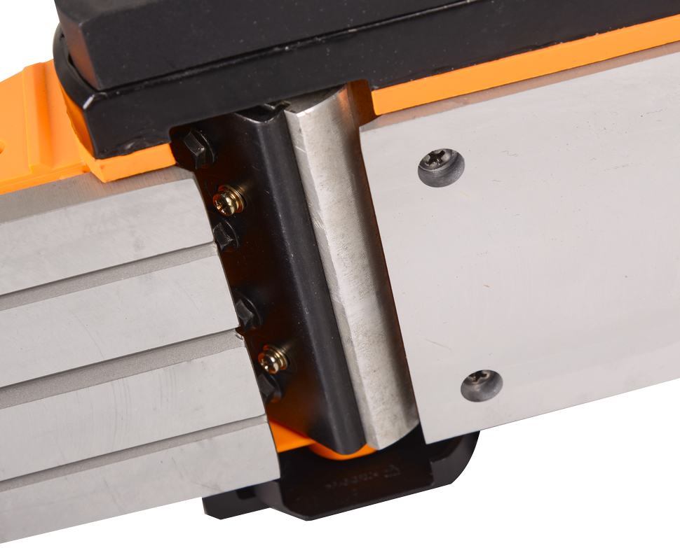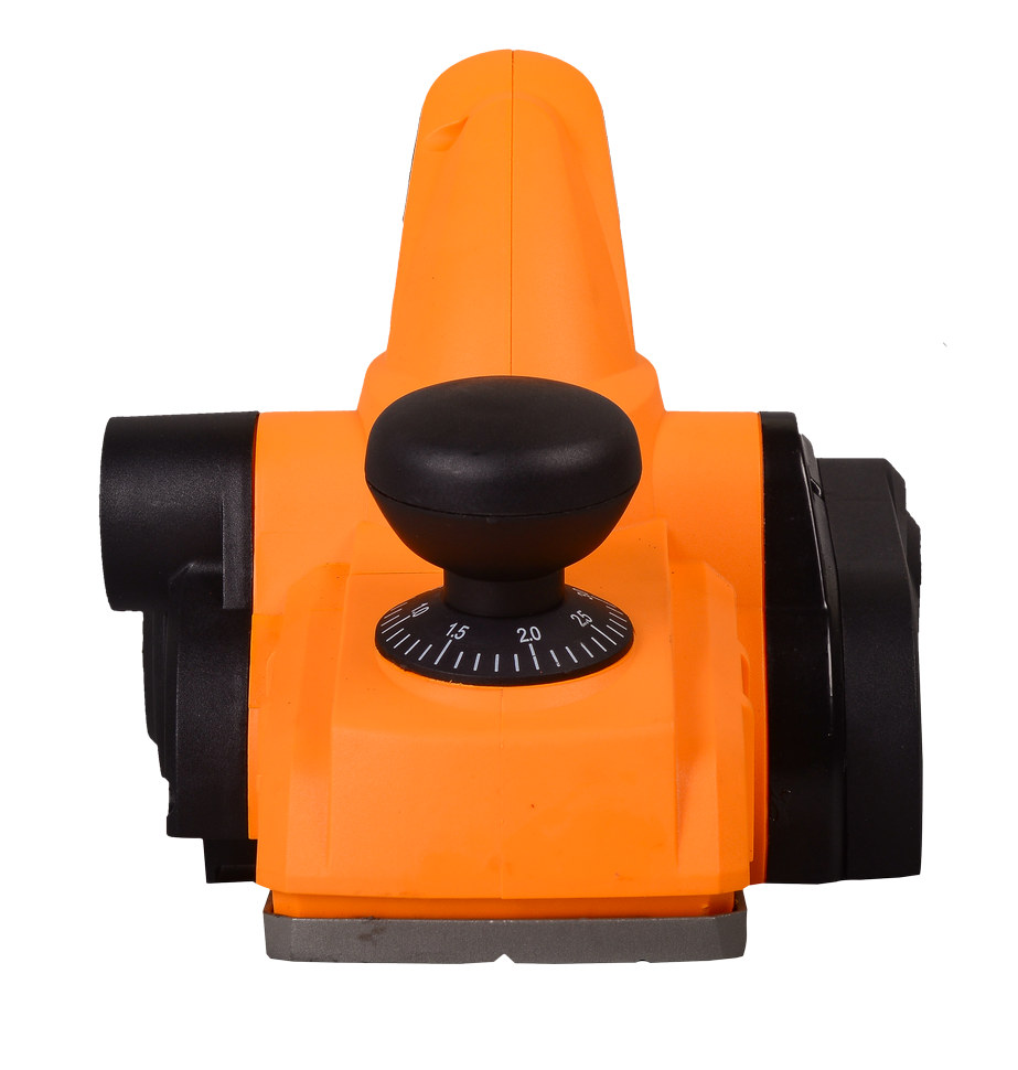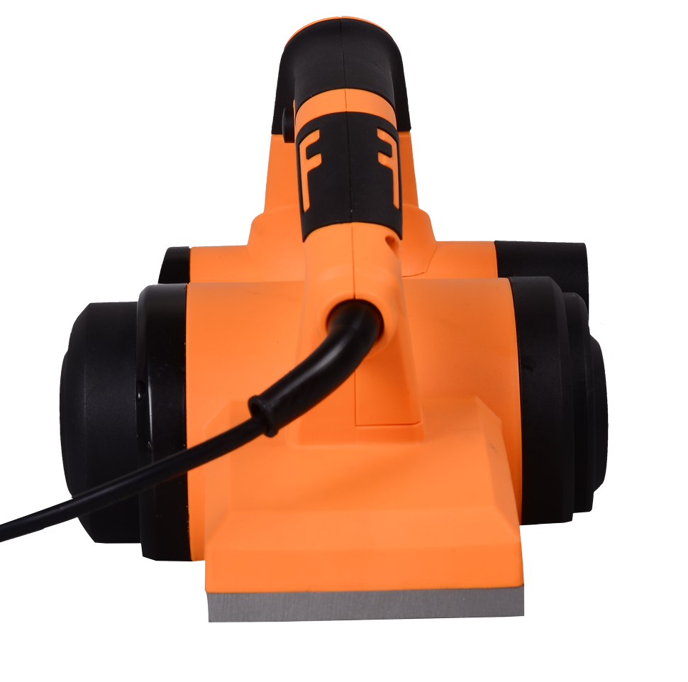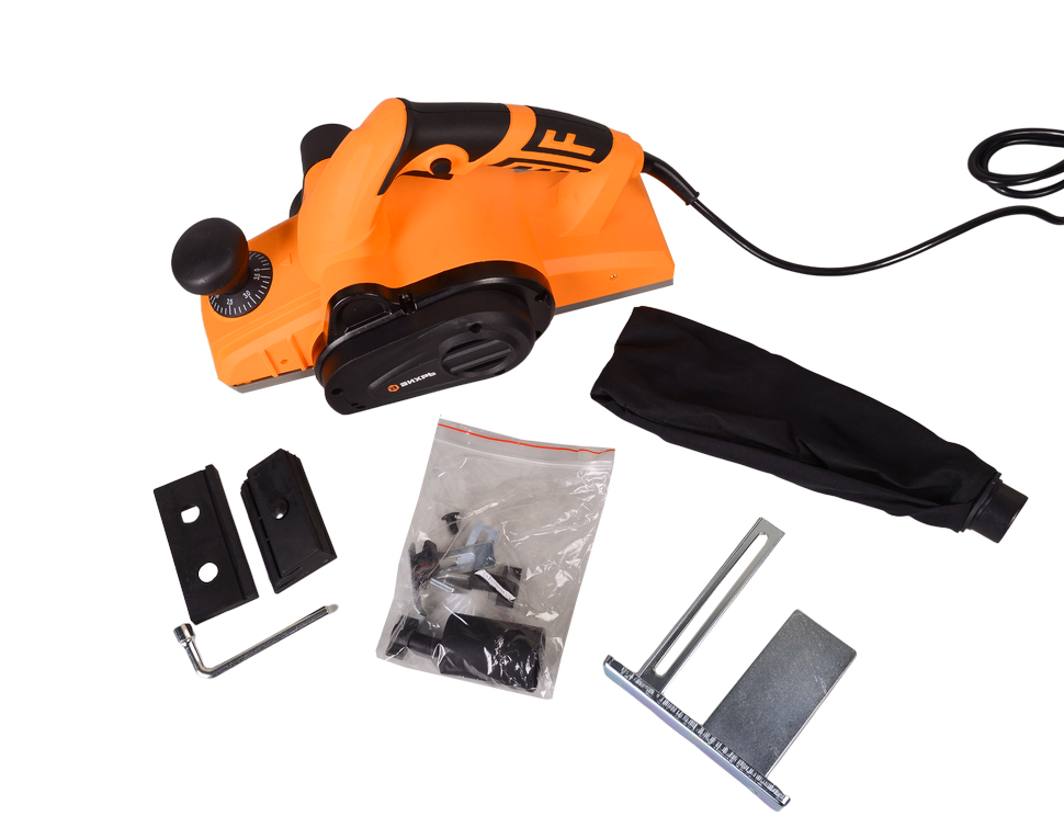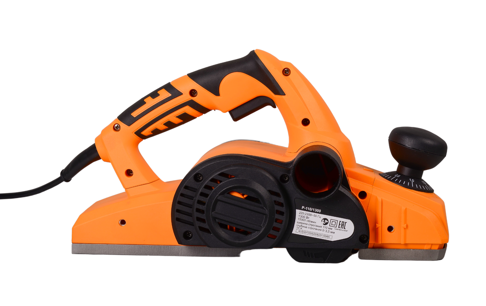 Электродвигатель мощностью 1300 Вт и числом оборотов 15000 об/мин обеспечивает эффективность строгания плоских деревянных поверхностей и фасок. Устройство подойдет для любых стройматериалов: бруса, доски, горбыля. Ширина строгания составляет 110 мм. Глубину строгания можно плавно регулировать от 0 до 3,5 мм путем поворота рукоятки. Шаг регулировки равен 0,25 мм. Совмещение функций регулировки и дополнительной опоры в одной шарообразной ручке повышает комфортность использования инструмента. Электрический рубанок оснащен блокировкой для устранения риска случайного запуска двигателя. В случае длительного непрерывного строгания кнопку выключателя можно зафиксировать, чтобы не удерживать ее пальцем постоянно. Устройство оснащено патрубком для отведения пыли. Стружка отбрасывается в сторону. Инструмент комплектуется ножами с двухсторонней заточкой. В случае затупления одной стороны лезвие можно перевернуть и продолжить работу. В целях улучшения качества производимых работ рекомендуется регулярно производить заточку или замену ножей новыми.
