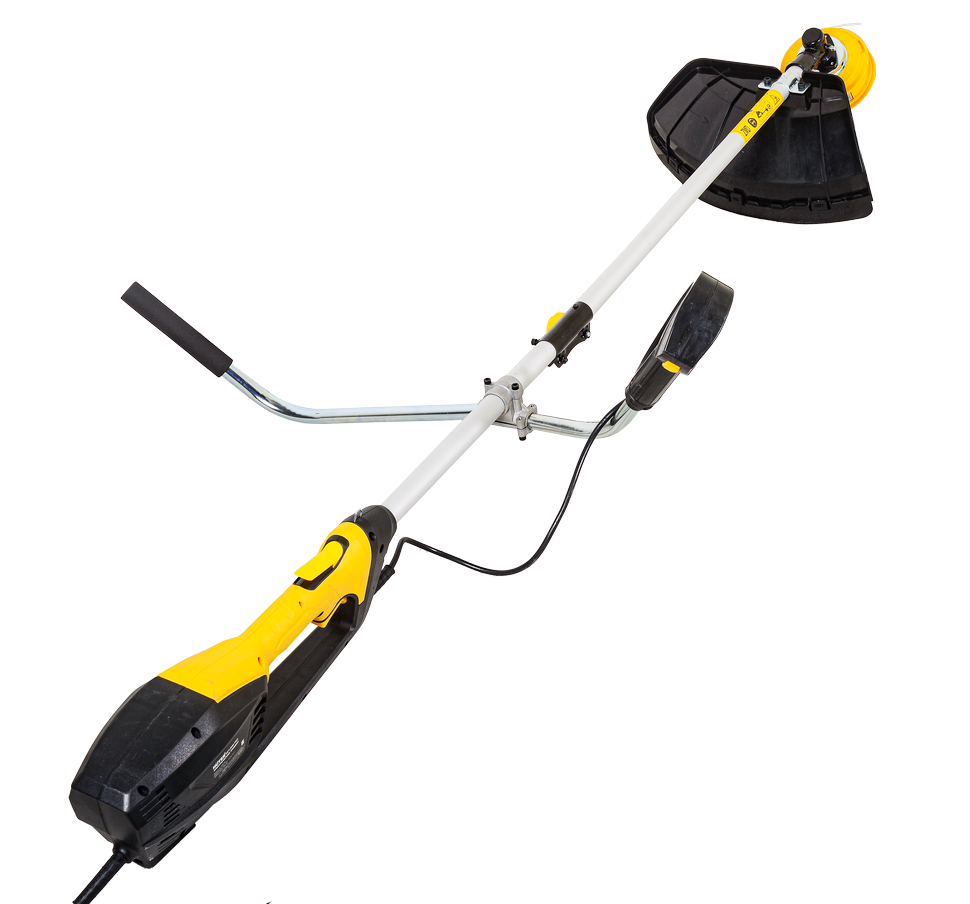 Электрический триммер работает от однофазной сети. Скорость вращения режущего элемента достигает 8000 об/мин, обеспечивая высокую производительность. В комплект входит головка с нейлоновой леской толщиной 2-3 мм и нож 3Т. Ширина скоса леской составляет 42 см. Для более густой поросли используется нож. Обрезчик лески регулирует ее длину, препятствует излишнему вытягиванию из катушки.
