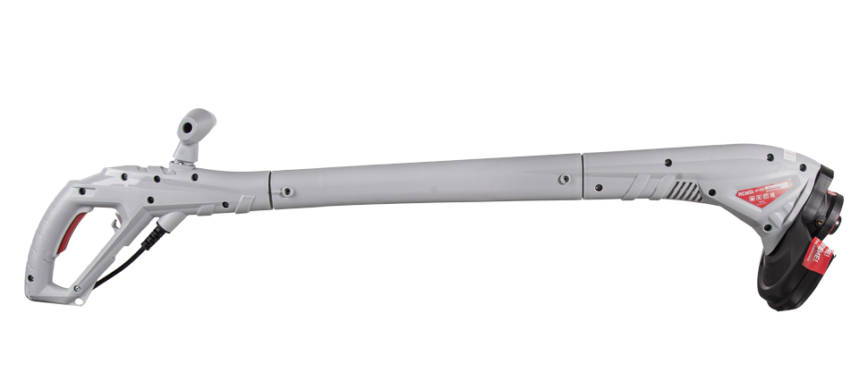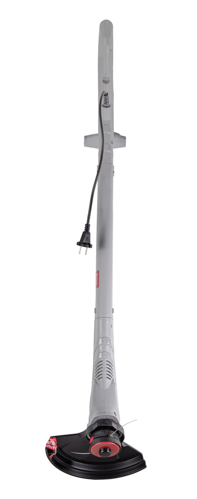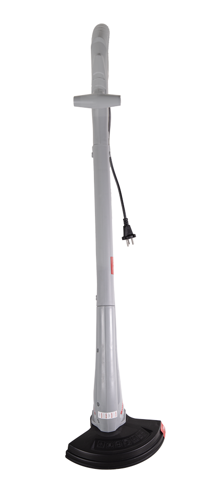 Модель работает от сети и оснащена электродвигателем с воздушным охлаждением. Нижнее расположение мотора обеспечивает прямую передачу крутящего момента. Электротриммер работает с нейлоновой леской 1,2 мм, которая при вращении со скоростью 10000 об./мин эффективно срезает мягкую и жесткую траву, сухостой, тонкие ветки. Обратите внимание, что данный триммер не подходит для кошения влажной травы. Для удобства обрезания лески нужной длины имеется специальный резчик. Данная модель отличается минимальной шириной кошения, которая составляет 24 см. Это обеспечивает удобство скашивания травы в местах, куда не может проникнуть газонокосилка. С помощью такого компактного устройства можно скосить траву под кустарниками, в междурядье, под домом, забором. В нижней части конструкции расположен пластиковый кожух, отводящий в сторону камни, ветки, траву во избежание травмирования ног оператора. Кнопка включения вынесена на рукоятку, на штанге расположена дополнительная поперечная ручка для легкого удержания. Электротриммер весит 1,35 кг, прост в использовании, подходит для людей любого возраста и пола.
