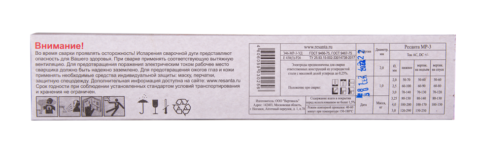 Диаметр электродов Ресанта МР-3 Ф2,0 составляет 2 мм, длина - 350 мм. Вес в пачке - 1 кг.