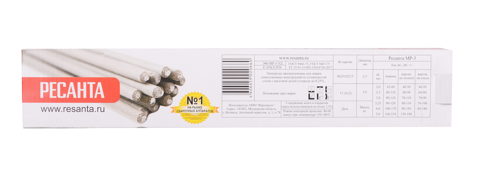 Диаметр электродов Ресанта МР-3 Ф2,5 составляет 2.5 мм, длина - 350 мм. Вес в пачке - 3 кг.