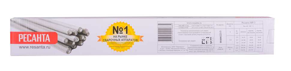 Диаметр электродов Ресанта МР-3 Ф4,0 составляет 4 мм, длина - 450 мм. Вес в пачке - 3 кг.