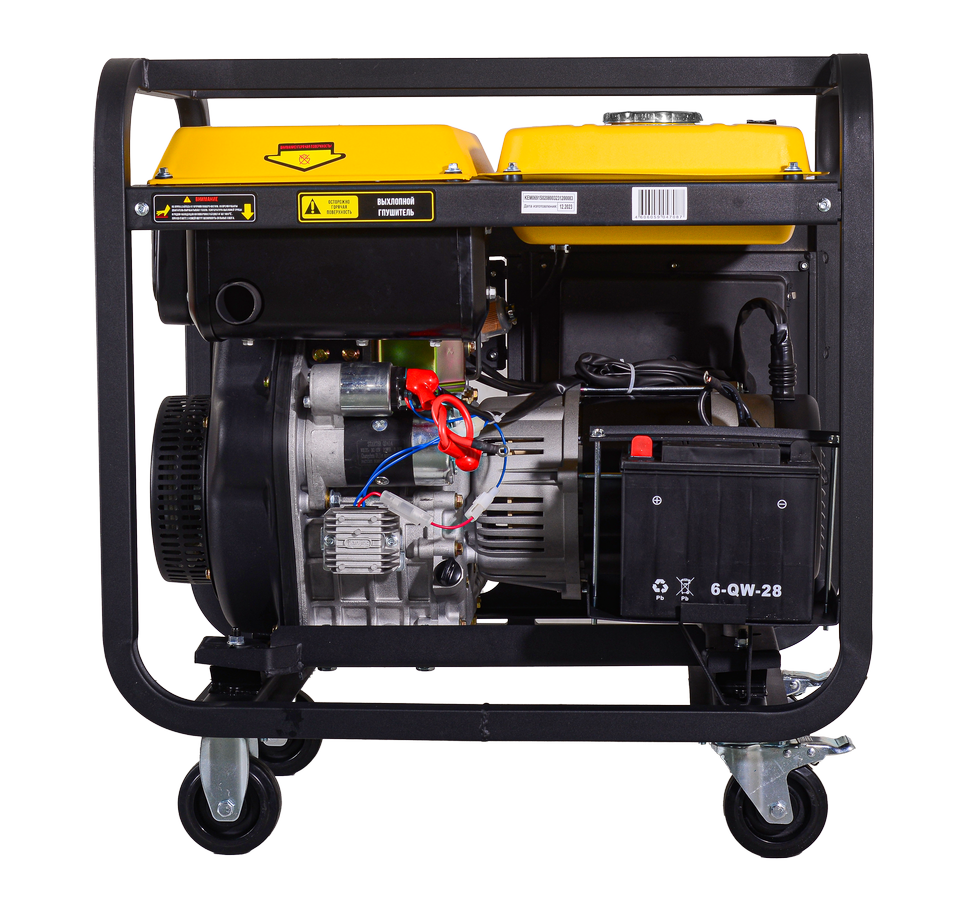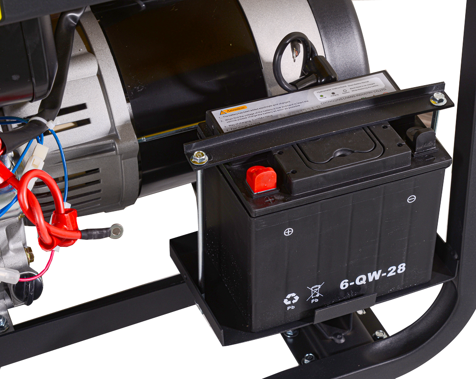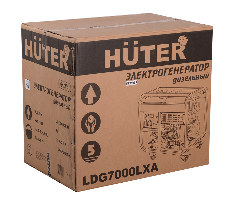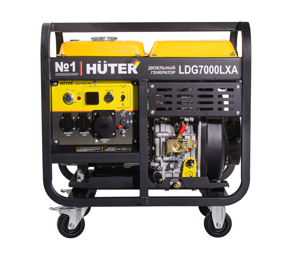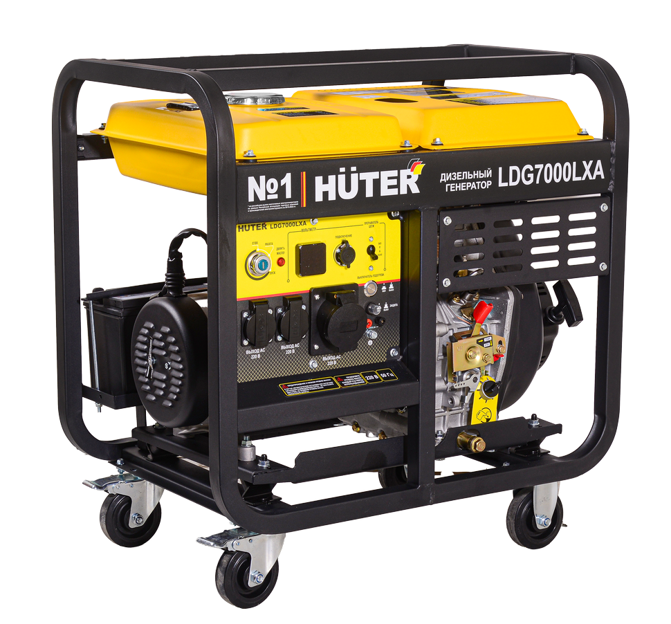 Дизельный генератор данной модели относится к переносным электростанциям, но его вес составляет 114,8 кг. Комплектуется комплектом колес для удобства перемещения. Запускается от ручного и электростартера, работающего от аккумулятора 12 В. Емкость для смазочной жидкости вмещает 1700 мл. Благодаря этому, генератор Huter LDG 7000LXА может работать длительное время без дозаправки.