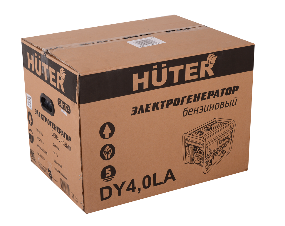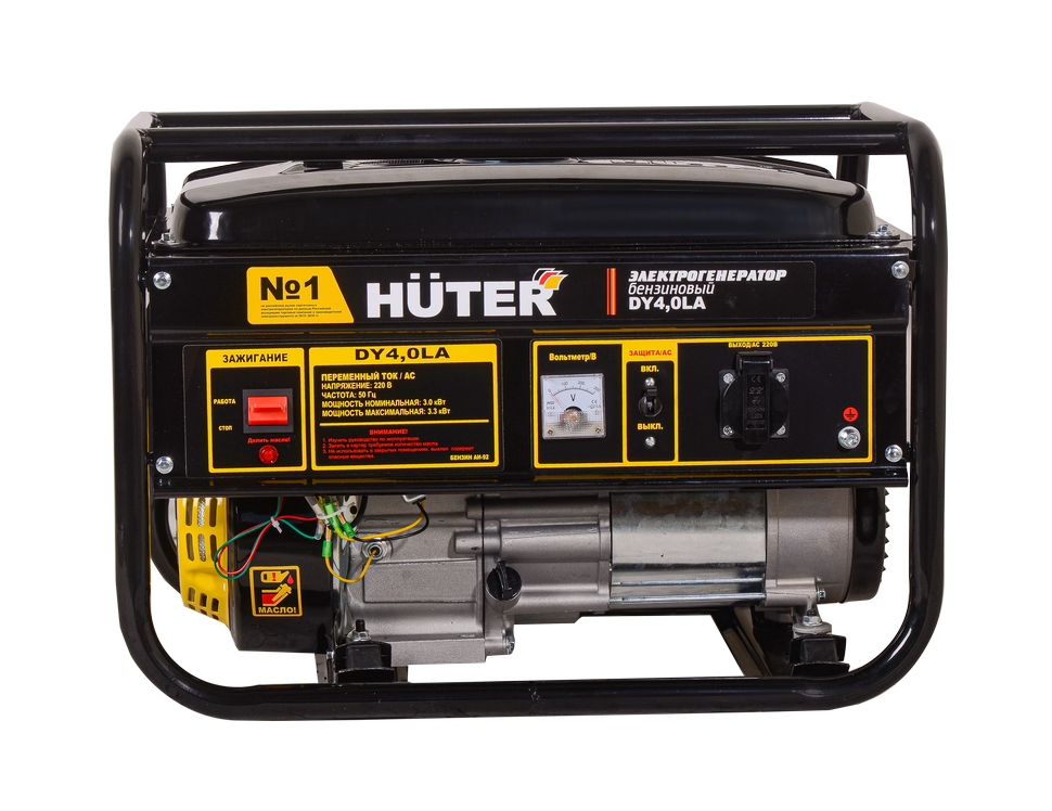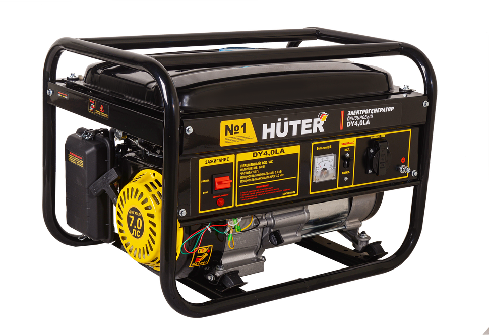 Электрогенератор HUTER DY4,0LА предназначен для организации автономного или резервного снабжения электроэнергией там, где отсутствует система центрального электроснабжения или случаются частые отключения электроэнергии. Он оснащён карбюраторным одноцилиндровым бензиновым двигателем мощностью в 7 л.с. Данный бензогенератор работает на неэтилированном бензине марки АИ 92. Вес электрогенератора составляет 43 кг.