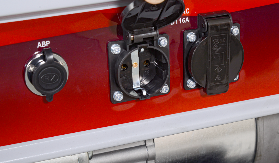 Бензогенератор встроен в усиленную несущую раму из гнутой квадратной трубы, оснащен съемными резиновыми опорами, снижающими вибрацию. На лицевой стороне устройства установлен многофункциональный прибор с цифровой индикацией напряжения, частоты тока, счётчика моточасов.