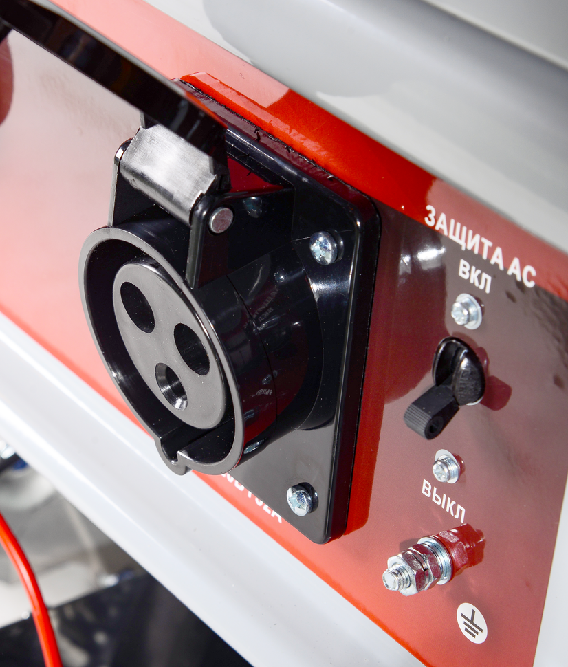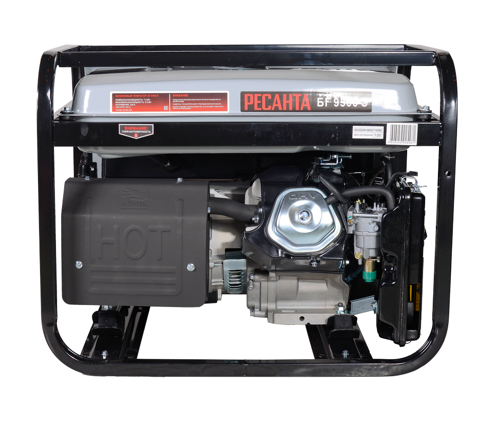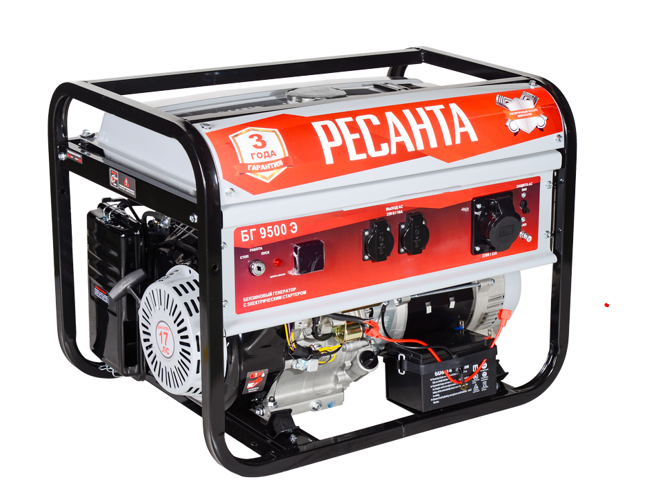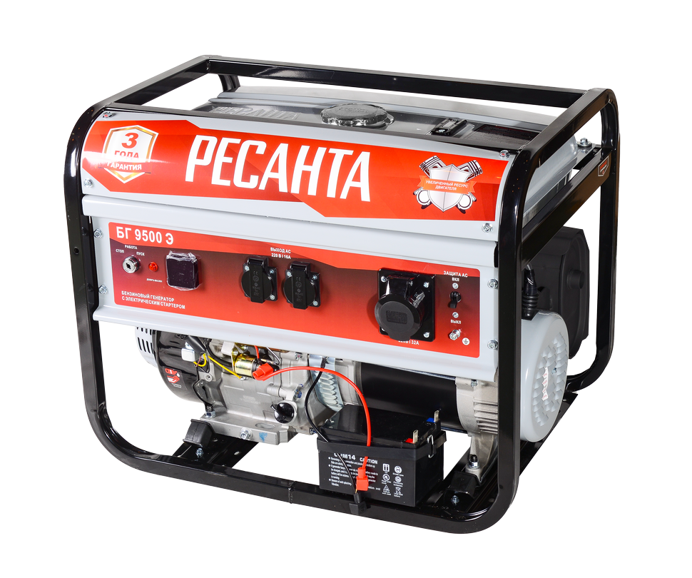 Запуск осуществляется за счет электростартера на АКБ, в комплекте имеется батарея. Ресанта БГ 9500Э выдает напряжение 220В при номинальной мощности 7500 Вт. Максимальная нагрузка до 8000 Вт. Бензогенератор оснащен тремя розетками: двумя по 16А и одной — 32А. Благодаря цифровому дисплею пользователь имеет полную информацию о моточасах, напряжении и частоте тока.