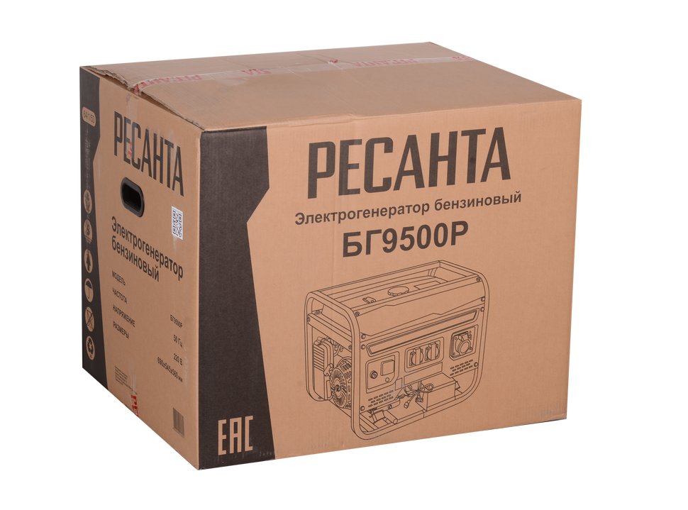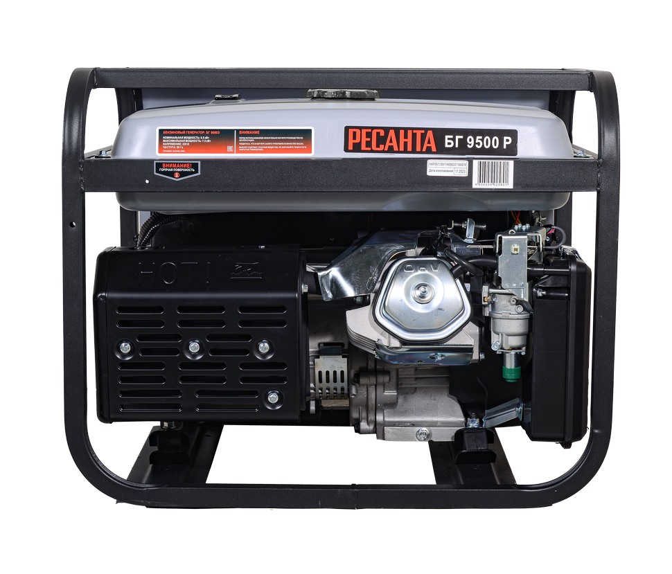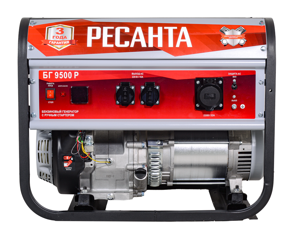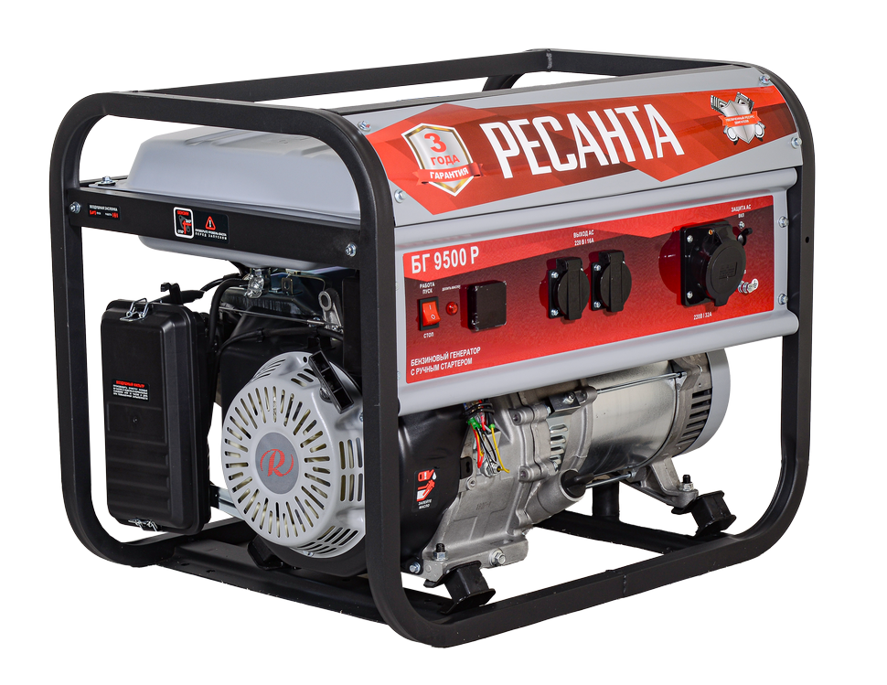 Бензиновый генератор Ресанта БГ 9500Р мощностью 7500 Вт с ручным стартером и 25-литровым топливным баком обеспечит бесперебойную работу электроприборов и оборудования в местах, где отсутствует центральное энергоснабжение, или в случае временного отключения электричества.