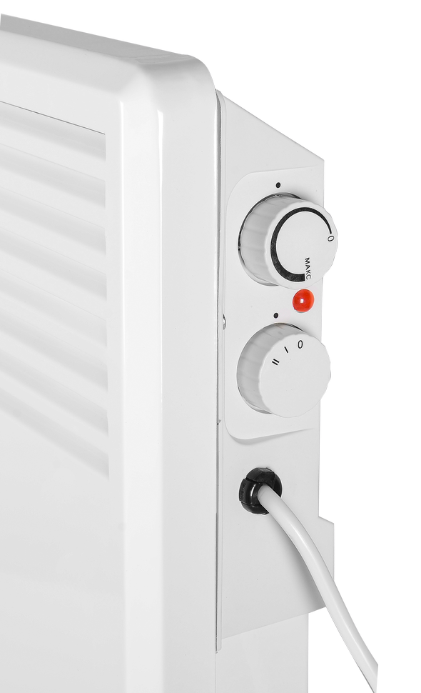 Электроконвектор работает от розетки и отличается удобной конструкцией. Плоский корпус белого цвета оснащен ручкой для плавной регулировки температуры и ручкой выбора режима нагрева. Мощность регулируется в двух диапазонах – 750 и 1500 Вт. В комплект входит набор креплений для фиксации конвектора на стене и шасси на колесах для установки конвектора на полу. При включении устройства нагревательный элемент из алюминиевого сплава быстро достигает рабочей температуры и начинает нагревать поступающий внутрь холодный воздух. Выходящие через решетку радиатора вверх теплые потоки вытесняют более холодные массы, за счет чего происходит конвекция воздуха и в комнате поддерживается заданный температурный режим.