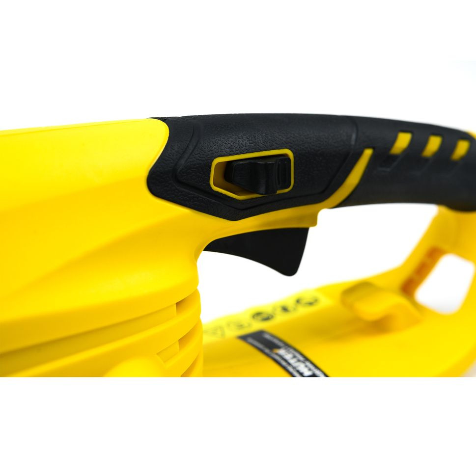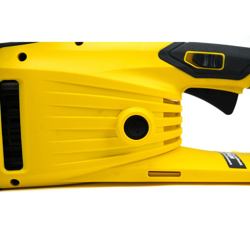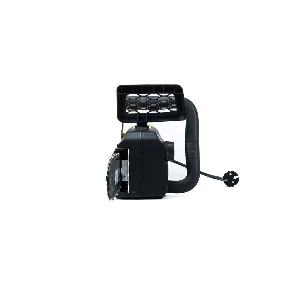 Электропила имеет эргономичную прорезиненную рукоятку. Фиксатор в ее основании предотвращает отсоединение штекера от розетки в процессе работы. Блокировка случайного включения и тормоз цепи обеспечивают безопасность эксплуатации.