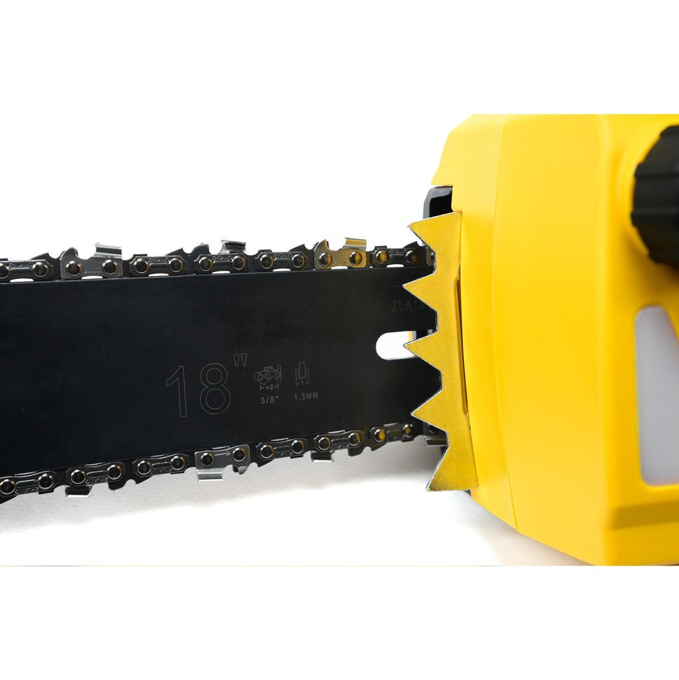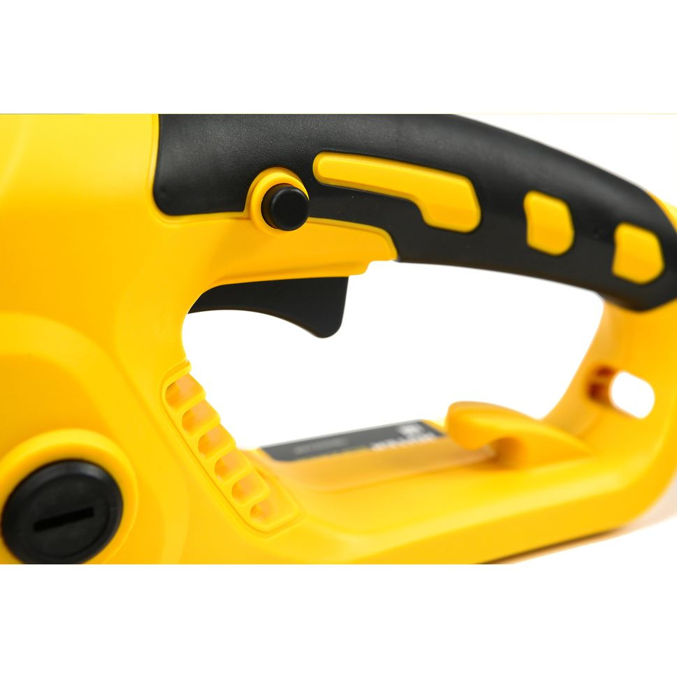 Блокировка от случайного включения и автоматический тормоз цепи обеспечивают безопасность эксплуатации. Фиксатор в ее основании предотвращает отсоединение штекера от розетки. Электропила имеет эргономичную прорезиненную рукоятку.