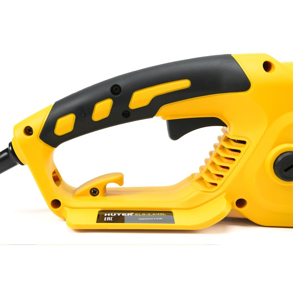 Пила HUTER ELS-2,4/45L работает от сети переменного тока 220В и не имеет ограничений по времени непрерывной работы. Преимуществом является отсутствие вредных выхлопов и низкий уровень шума 64 дБ. Все это позволяет использовать инструмент не только на улице, но и в помещении.