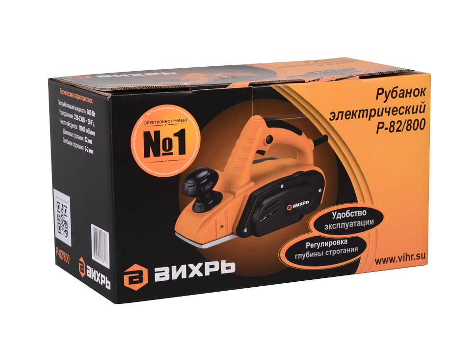 Модель Вихрь Р-82/800 обеспечивает направленный выброс стружки и позволяет плавно регулировать обороты. Рабочим инструментом рубанка являются ножи, имеющую двустороннюю заточку. Для исключения случайных включений рубанка имеется специальная защита выключателя, которая требует перед включением инструмента предварительного нажатия клавиши предохранителя. Эффективная вентиляция и охлаждение электродвигателя осуществляется за счёт специально предусмотренных отверстий в корпусе. Питание – от сети 220 В, 50 Гц. Вес инструмента – 2.6 кг.