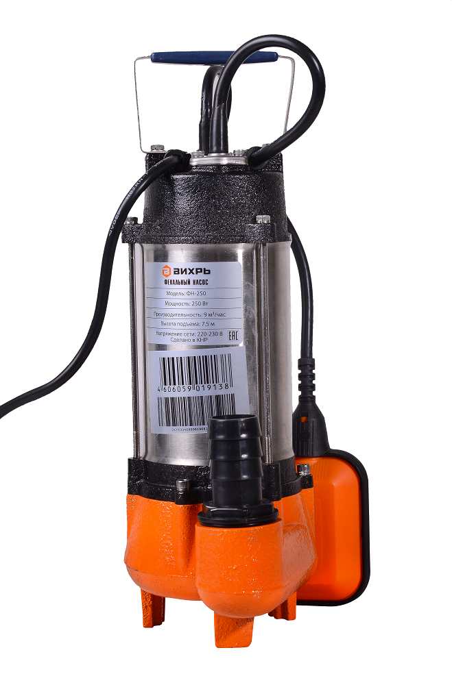Насос имеет погружную конструкцию в вертикальном исполнении. Тип забора воды – нижний. В конструкцию входит поплавковый выключатель, позволяющий регулировать уровень срабатывания. Модель Вихрь ФН-250 оснащена надёжным асинхронным электродвигателем. Мощность фекального насоса – 250 Вт. Максимальная подача воды – 150 л/мин. Высота напора – 7.5 м. Насос рассчитан на 20 включений в час. Допустимая температура перекачиваемой жидкости – от +1°С до +35°С. Конструкция агрегата герметичная. Степень защиты – IPX8. Параметры сети электропитания – 220 В, 50 Гц.