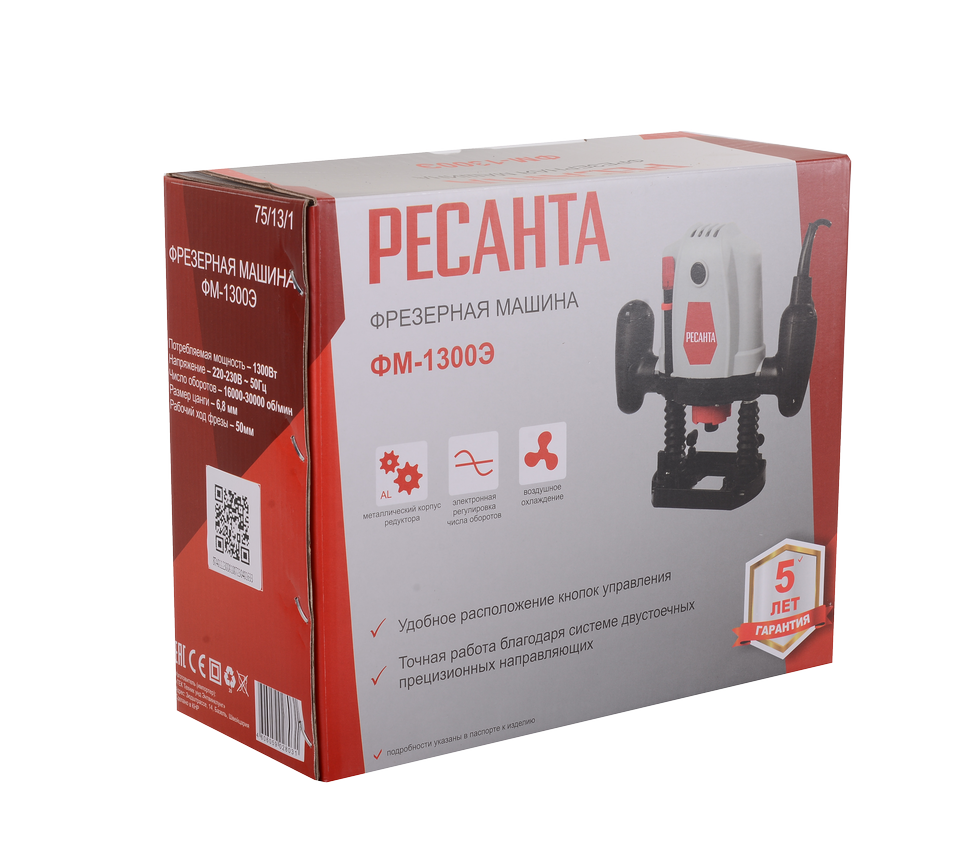 Среди преимуществ модели Ресанта ФМ-1300Э важно отметить возможность регулировки глубины, что расширяет возможности фрезеровщика и обеспечивает высокую точность работы. Во фрезере реализована возможность регулировки скорости, что позволяет решать разноплановые задачи. Модель оснащена блокировкой шпинделя, широкой подставкой, прочной алюминиевой подошвой, эргономичными ручками и пониженной вибрацией. Всё это делает работу с фрезером удобной и безопасной. Инструмент питается от бытовой электросети 200 В, 50 Гц. Машина предназначена исключительно для домашнего использования.