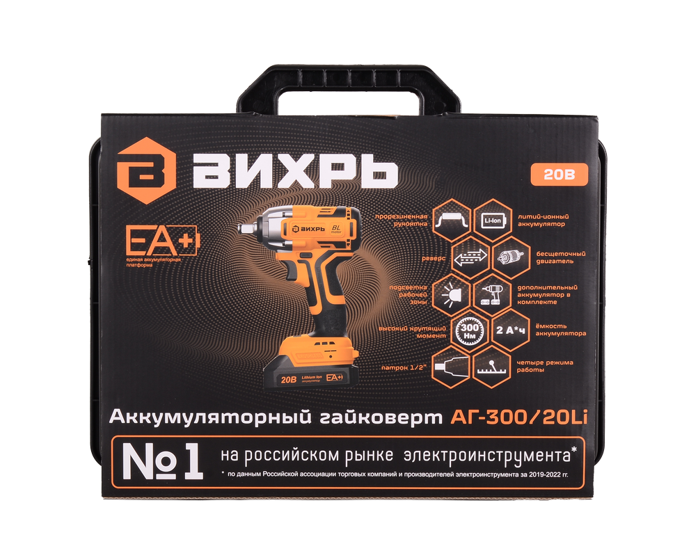 В комплекте Вихря АГ-300/20Li идут 2 аккумулятора. Емкость каждого равна 2 А*ч, можно долго работать без перерывов на подзарядку. Смена аккумулятора занимает не более минуты. Эргономичный кейс упрощает хранение и транспортировку.