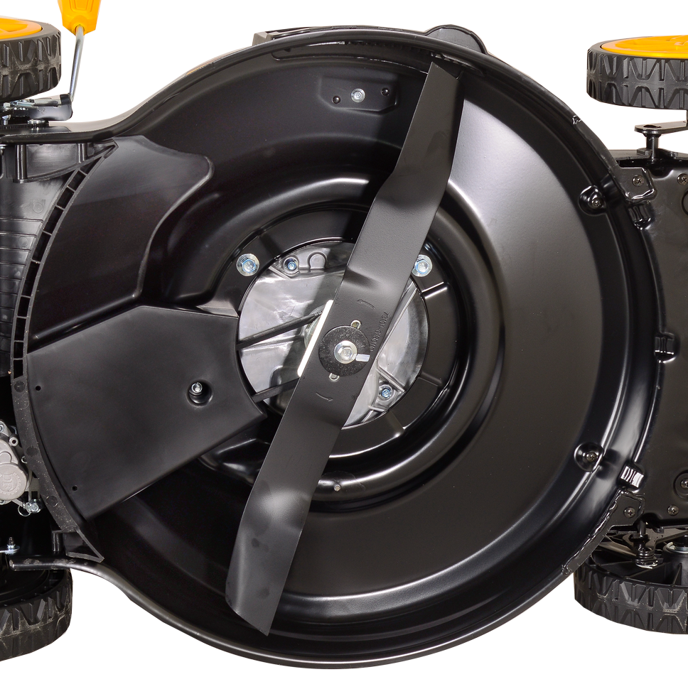 Высокая производительность работы обусловлена увеличенной до 53 см шириной скашивания. Высота среза имеет 7 уровней и регулируется от 25 до 75 мм. Это позволяет срезать высокие и низкорослые растения. Функция мульчирования позволяет перерабатывать скошенную траву для последующего удобрения почвы и уплотнения газонного покрытия. Вместительный тканевый травосборник объемом 65 л обеспечивает порядок на участке и не требует частого опустошения. Функция бокового выброса травы позволяет использовать газонокосилку без травосборника.