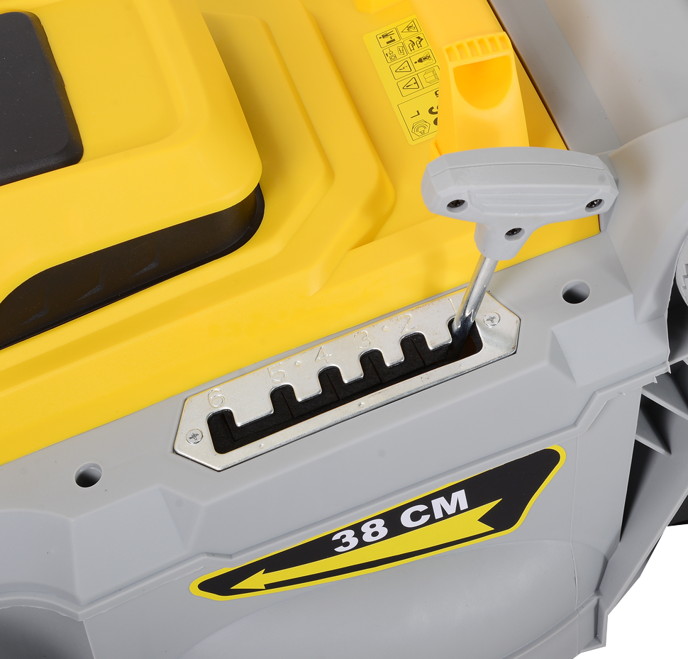 Благодаря рабочей ширине 380 мм вы сможете обработать значительную площадь газона за меньшее время, что особенно важно на участках среднего и большого размера. Регулировка высоты среза от 25 до 55 мм позволяет выбрать оптимальную длину травы – от короткого партерного газона до мягкой лужайки.