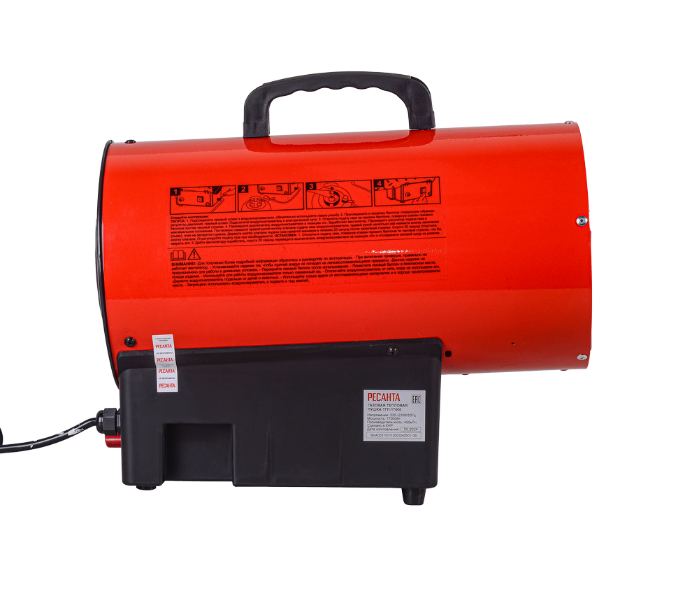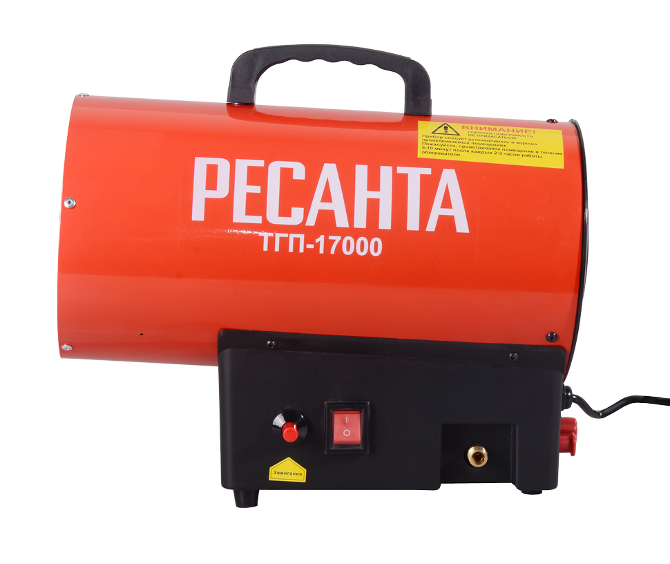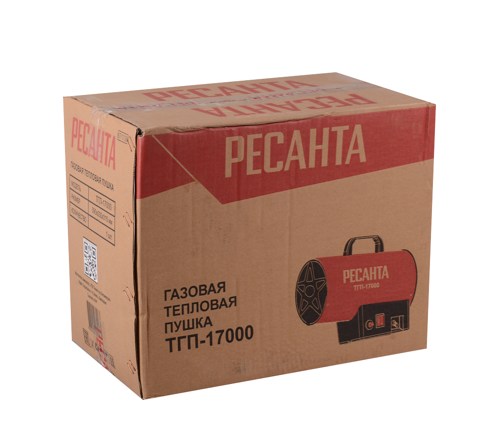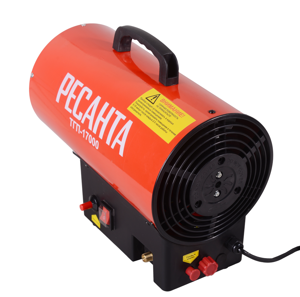 Благодаря встроенной системе защиты от перегрева прибор Ресанта ТГП-17000 полностью безопасен при длительном использовании. Пушка также оснащена регулятором подачи топлива и специальной системой, препятствующей угасанию огня. Благодаря такой конструкции исключается утечка топлива. Тепловая пушка на газовом топливе обладает простой конструкцией, за счёт чего удобна в использовании. Однако она не подходит для установки в жилых помещениях. Теплопушка поставляется в комплекте с ручкой, газовым шлангом и регулятором давления.