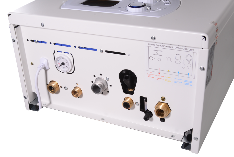 первый предназначен для подключения собственно системы отопления, в том числе теплых полов; второй — это возможность получать до 10 литров горячей воды в минуту.