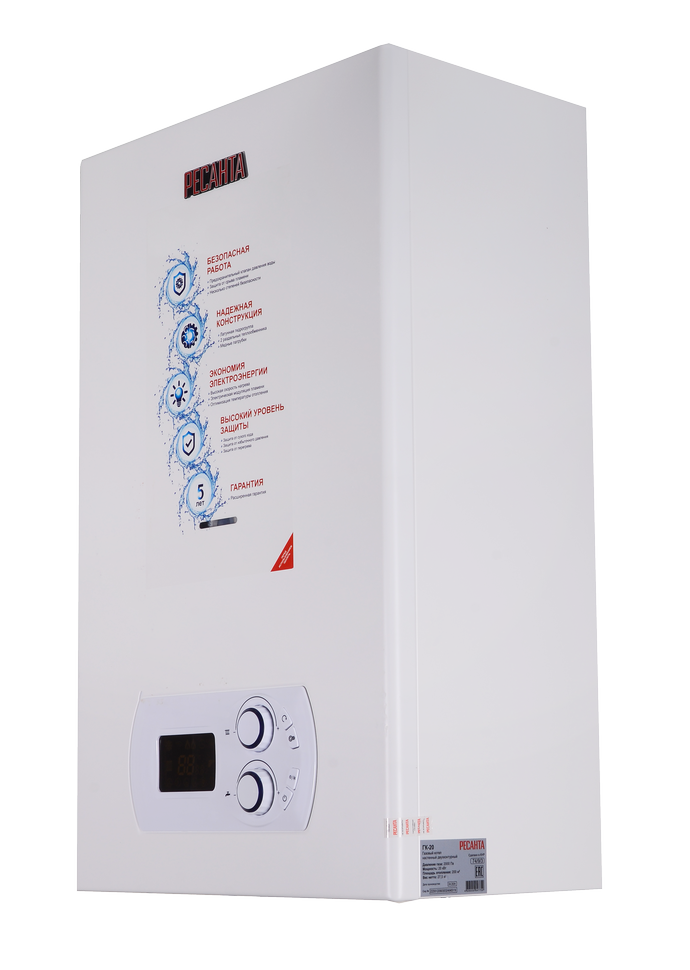 Преимуществом Ресанта ГК-20 является защита от замерзания. При снижении температуры теплоносителя доминимальных значений прибор самостоятельно включается и подогревает его до 30 градусов. Многофункциональный дисплей делает управление максимально простым. На нем отображаются и возможные сбои в работе, что позволяет сразу предпринять необходимые меры в случае неисправностей. Котел имеет два раздельных теплообменника: первичный из меди с защитным покрытием, вторичный из нержавеющей стали.