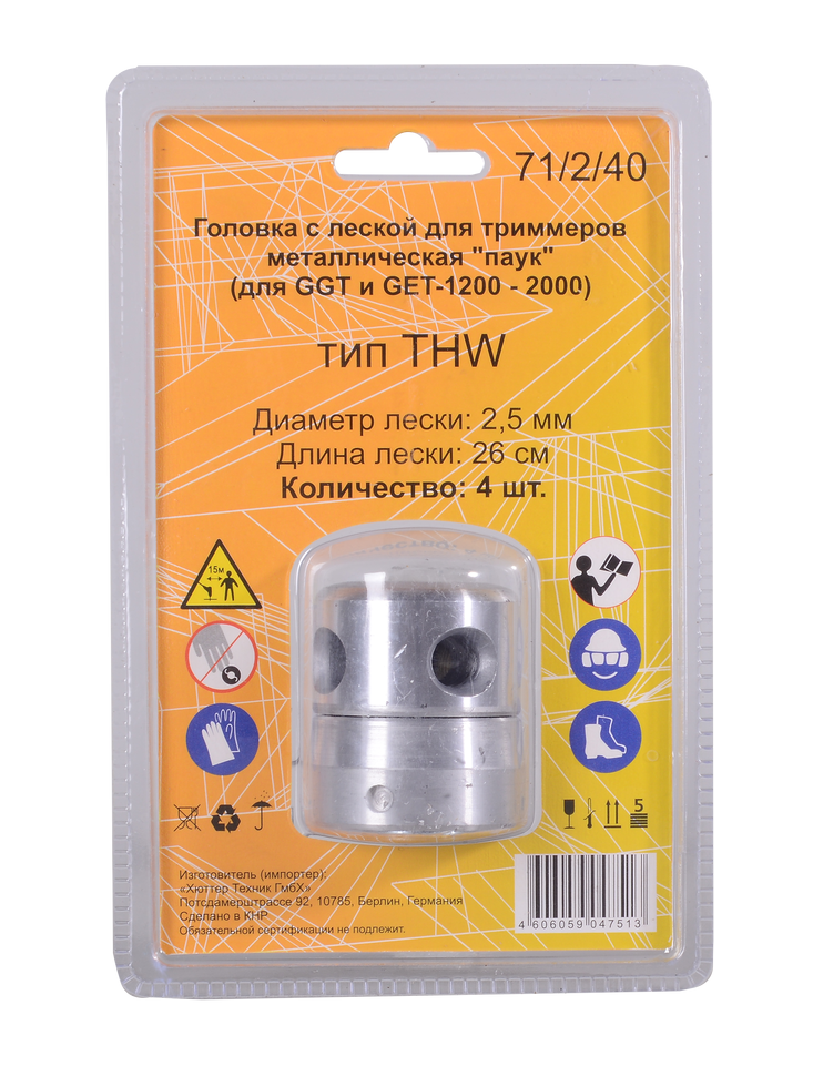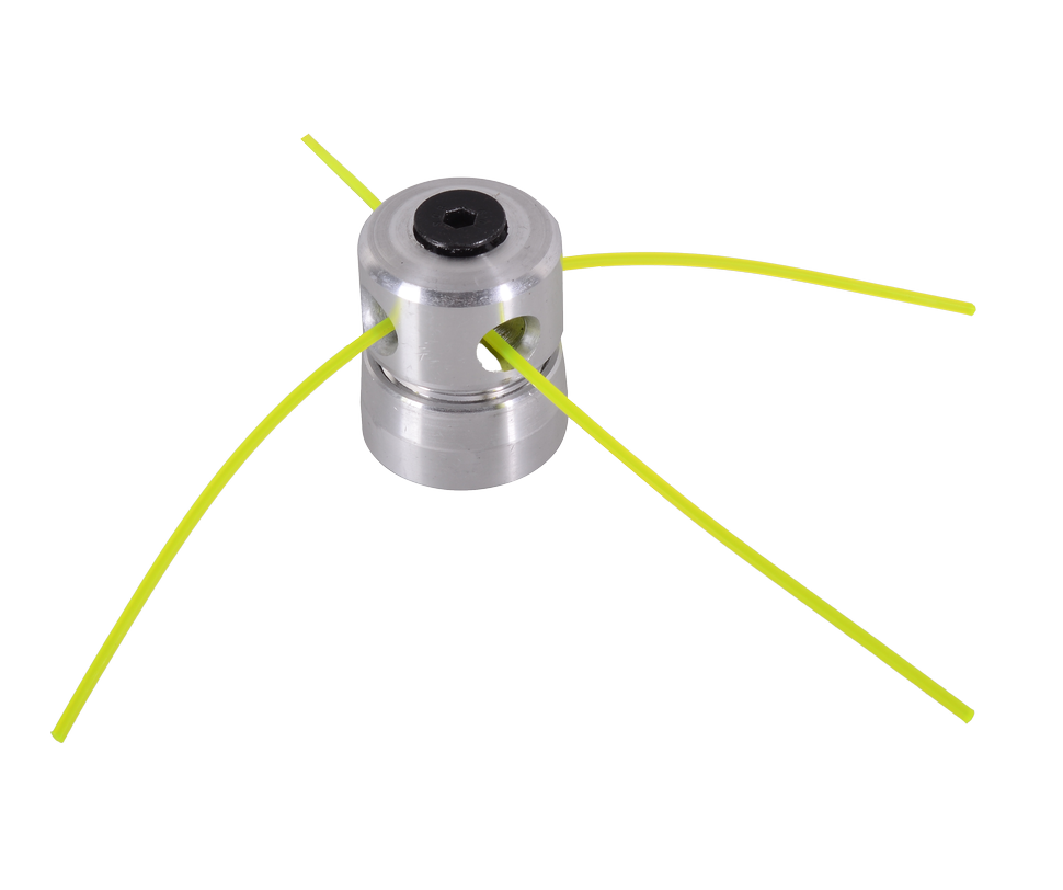 Головка с леской металлическая "паук" обеспечивает надежное крепление и эффективную работу при кошении травы и сорняков. Конструкция выполнена из алюминия, что повышает износостойкость изделия, гарантируя продолжительный срок эксплуатации даже при интенсивном использовании в условиях сада и огорода. Катушка крепится стандартным способом на ось типа M10x1.25RH, аналогично монтажу обычного диска-ножа. Ручная конструкция позволяет легко заправлять лески вручную. Диаметр подходящей лески от 2 до 4 мм, длина 26 см.
