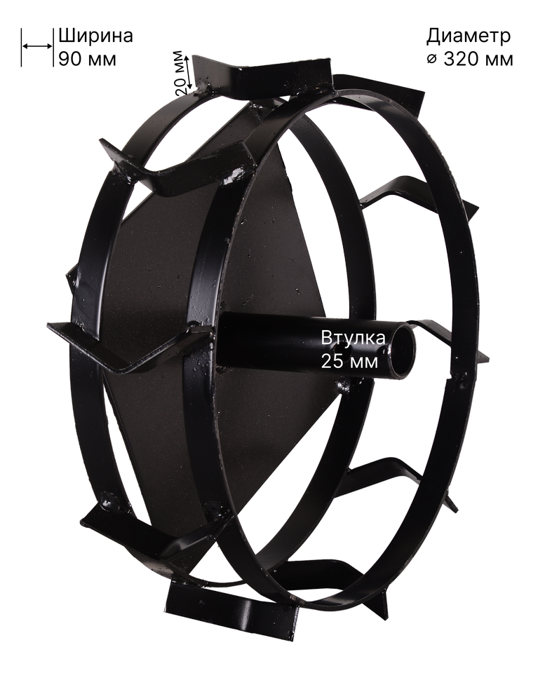 Грунтозацеп с кронштейном крепится к валу редуктора вместо стандартных колес. Надежность фиксации достигается за счет втулки, предупреждающей слетание при высоких нагрузках. Наружный диаметр 320 мм дает возможность прохождения участков большой площади.