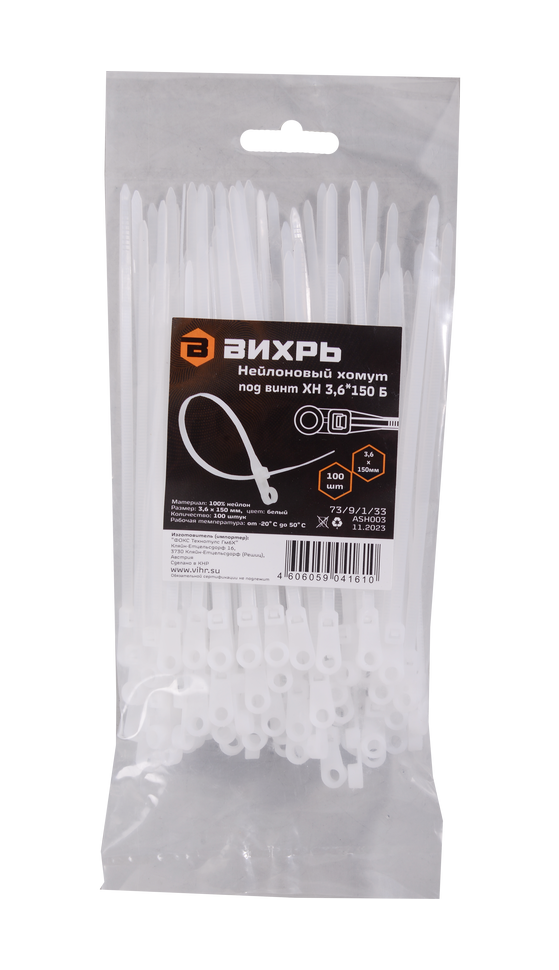Хомут нейлоновый Вихрь 3,6х150 Б с отверстием под винт предназначен для крепления кабелей, проводов, гофротруб и других предметов к поверхности или для их соединения между собой. Этот крепежный элемент изготавливается из белого нейлона, что гарантирует его прочность и эластичность. Длина стяжки - 15 см, ширина - 3,6 мм.