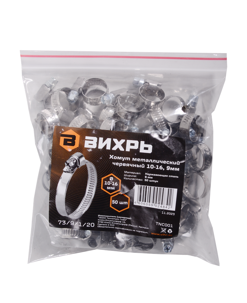 Хомуты металлические червячные Вихрь 10-16, 9мм - это крепежные элементы, которые используются для соединения и крепления труб, шлангов, патрубков. Они изготавливаются из высококачественной углеродистой стали. Детали имеют цинковое покрытие с хроматированием 6 мкм.