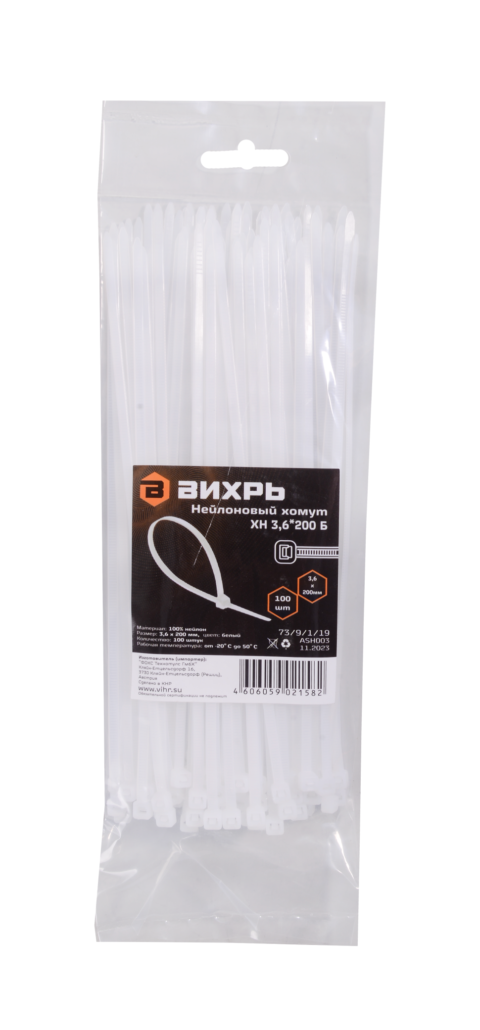 Хомуты нейлоновые Вихрь 3,6*180 Б - крепежные элементы, которые используются для соединения и крепления различных деталей и конструкций, электропроводки, кабелей. Они изготавливаются из белого нейлона. Длина стяжки - 18 см, ширина - 3,6 мм. Усилие на разрыв составляет более 200 кг/см3.