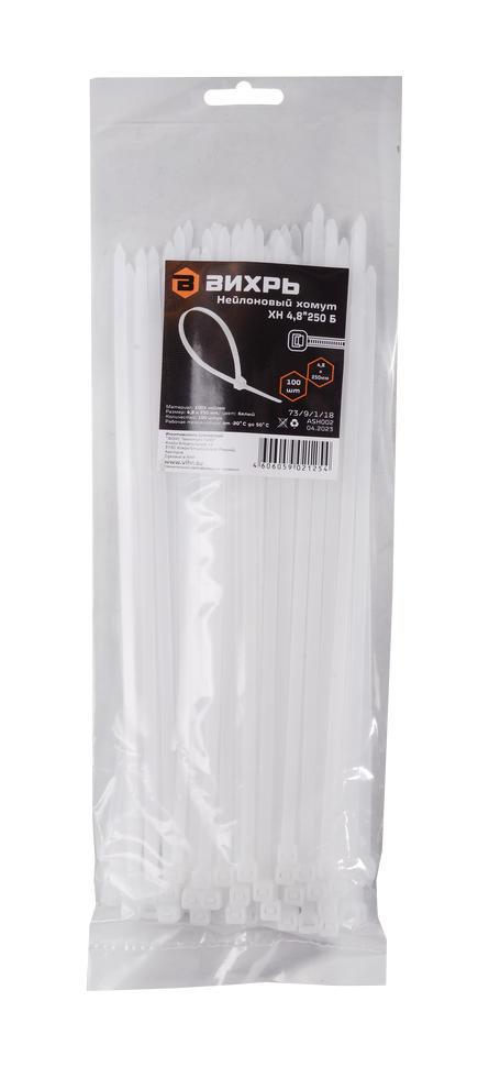 Хомуты нейлоновые Вихрь 4,8*250 Б - крепежные элементы, которые используются для соединения и крепления различных деталей и конструкций, электропроводки, кабелей. Они изготавливаются из белого нейлона. Длина стяжки - 25 см, ширина - 4,8 мм. Усилие на разрыв составляет более 200 кг/см3.