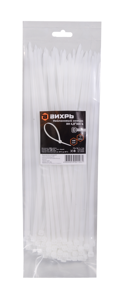 Хомуты нейлоновые Вихрь 4,8*300 Б - крепежные элементы, которые используются для соединения и крепления различных деталей и конструкций, электропроводки, кабелей. Они изготавливаются из белого нейлона. Длина стяжки - 30 см, ширина - 4,8 мм. Усилие на разрыв составляет более 200 кг/см3.