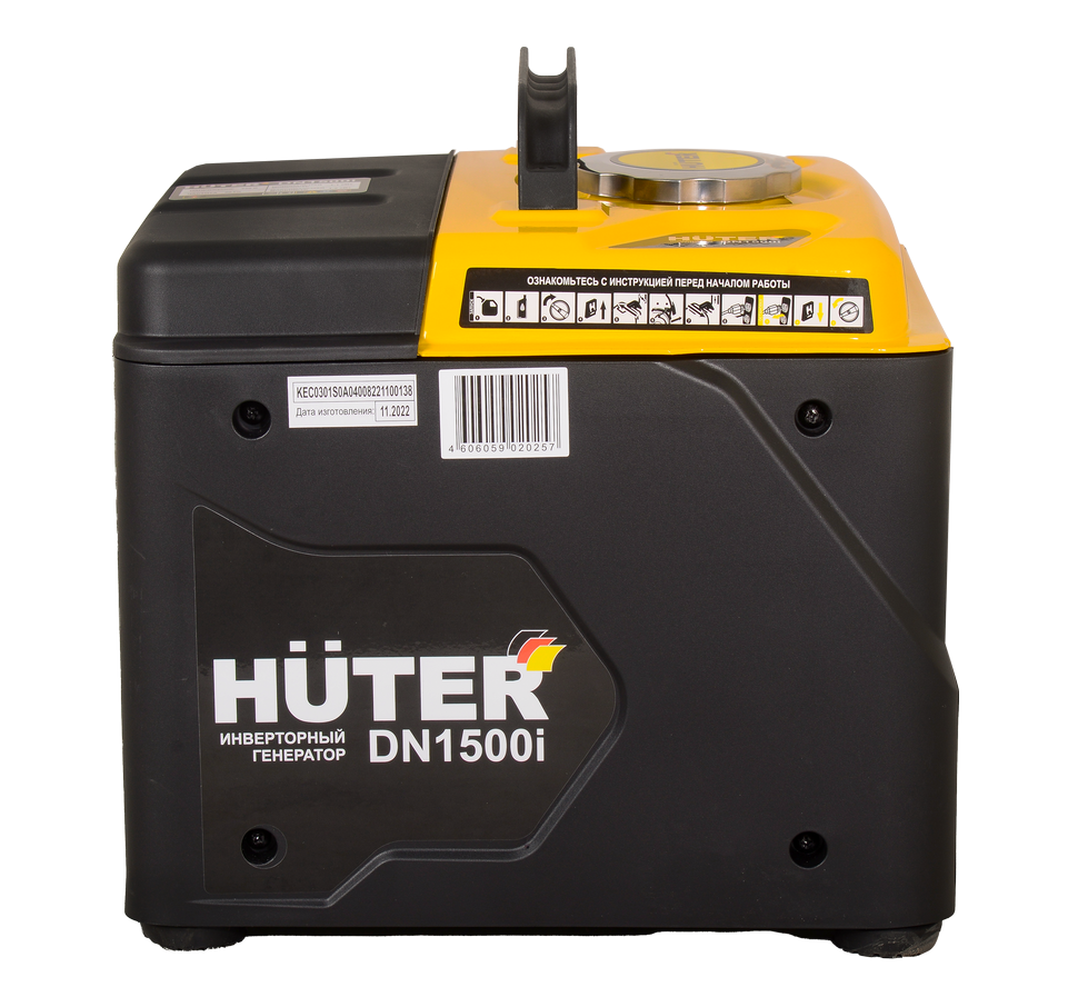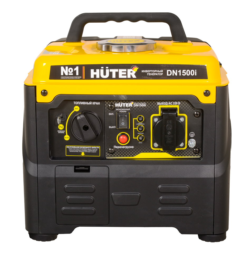 В модели HUTER DN1500i четырехтактный двигатель с воздушным охлаждением и защитой от перегрузки, который вырабатывает мощность 1,1-1,2 кВт. Стартер ручной. Автоматическая регулировка оборотов позволяет экономить топливо при неполной нагрузке. Топливный бак рассчитан на 3,5 л неэтилированного бензина высокой очистки с октановым числом не меньше 92.