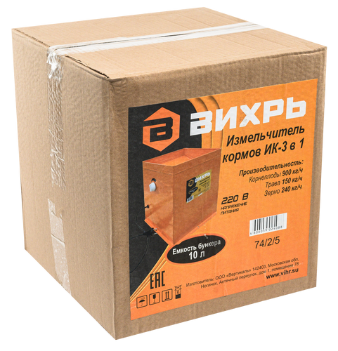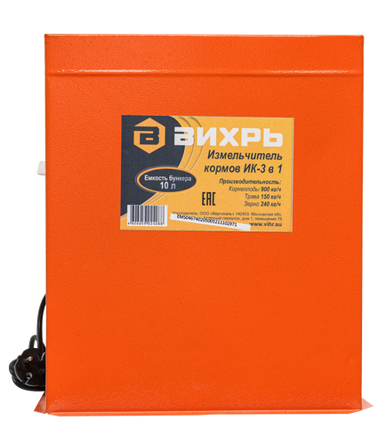 Модель ИК ВИХРЬ 3 в 1 оснащена однофазным коллекторным электродвигателем мощностью 1350 Вт, обеспечивающим скорость вращения рабочего инструмента в пределах от 0 до 12000 об/мин. Производительность модели при измельчении корнеплодов составляет 900кг/ч, зерна – 240кг/ч, сена или травы– 150кг/ч. Агрегат питается от электросети 220В, 50Гц. Габаритные размеры модели – 310х310х340 мм. Вес – 7 кг.