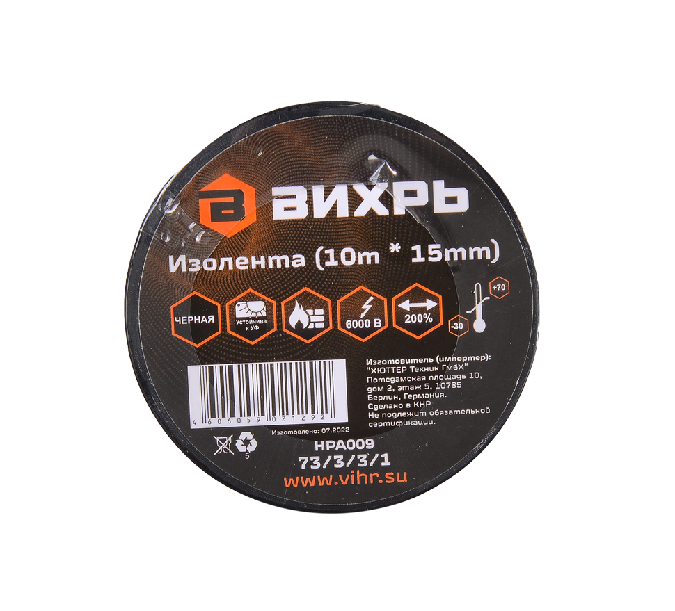 Изолента ВИХРЬ – это универсальный материал, который находит применение в различных сферах деятельности от ремонта до быта. Она состоит из поливинилхлоридной (ПВХ) основы, на которую нанесен клей. Ширина ленты - 15 мм, длина в рулоне - 10 м.