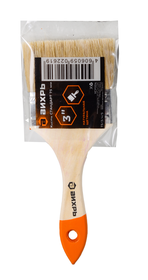 Кисть ВИХРЬ СТАНДАРТ 75 мм 3'' – это инструмент для малярных работ. Натуральная щетина обладает высокой впитывающей способностью и способна равномерно распределять краску по поверхности. Кроме того, она имеет отличную устойчивость к химическим воздействиям, что позволяет использовать ее с различными видами красок, лаков и грунтовок.