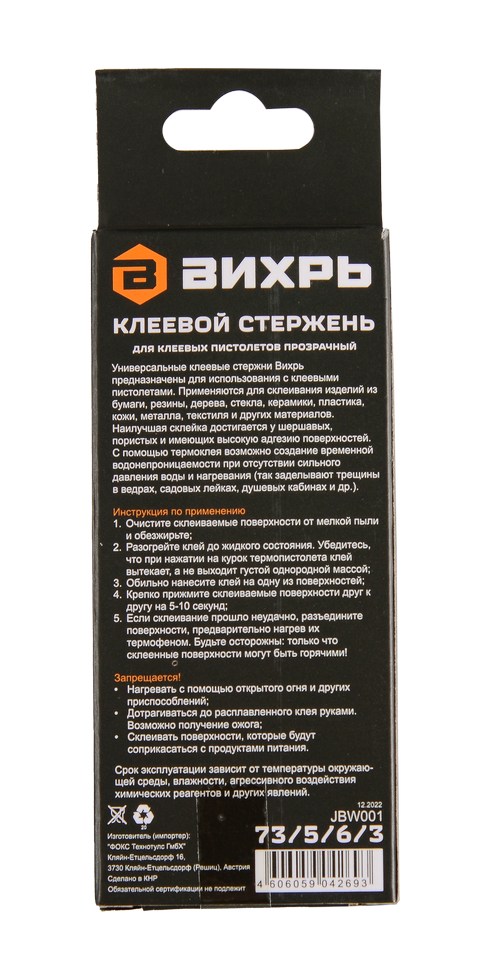 Клеевые стержни Вихрь предназначены для использования с клеевыми пистолетами и являются универсальными. Они могут использоваться для склеивания различных материалов, таких как бумага, резина, дерево, стекло, керамика, пластик, кожа, металл, текстиль и кабель в различных сочетаниях. Наилучшая склейка достигается у шершавых, пористых и имеющих адгезию поверхностей.