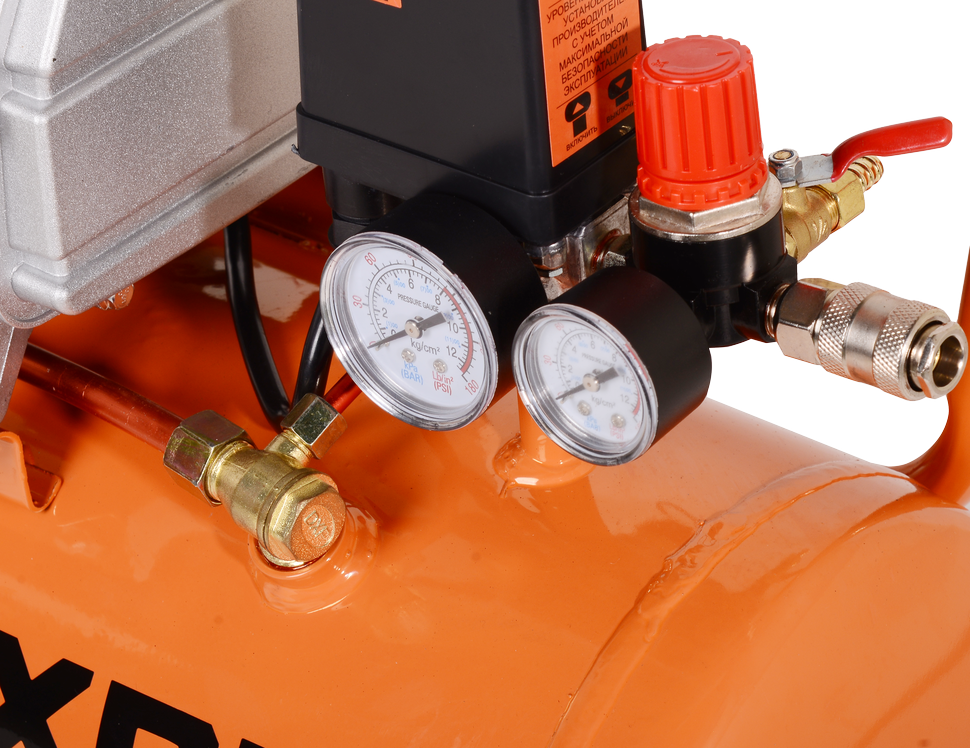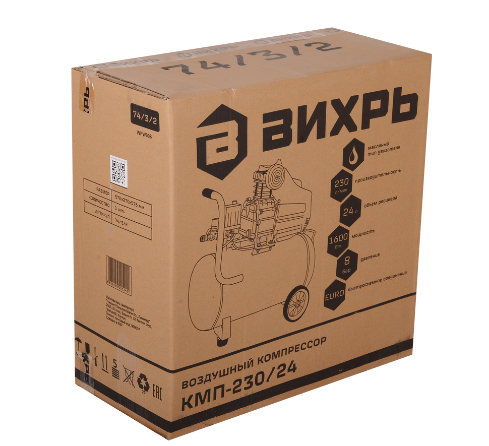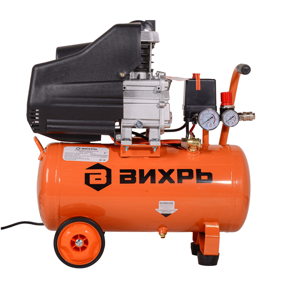 Для простой и быстрой транспортировки Вихрь КМП-230/24 имеет колеса и ручку. Специальные накладки на ножках обеспечивают антивибрационный эффект, а наличие разъемов EURO-рапид позволяет легко подключать различное пневматическое оборудование. Для контроля работы компрессора применяются два манометра, установленные на входе и выходе.