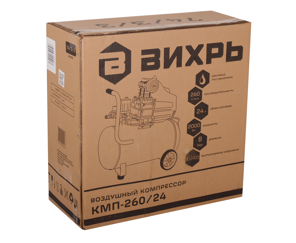 Компрессор Вихрь КМП-260/24 нагнетает сжатый воздушный поток для оптимальной работы пневмооборудования, в том числе на шиномонтаже.