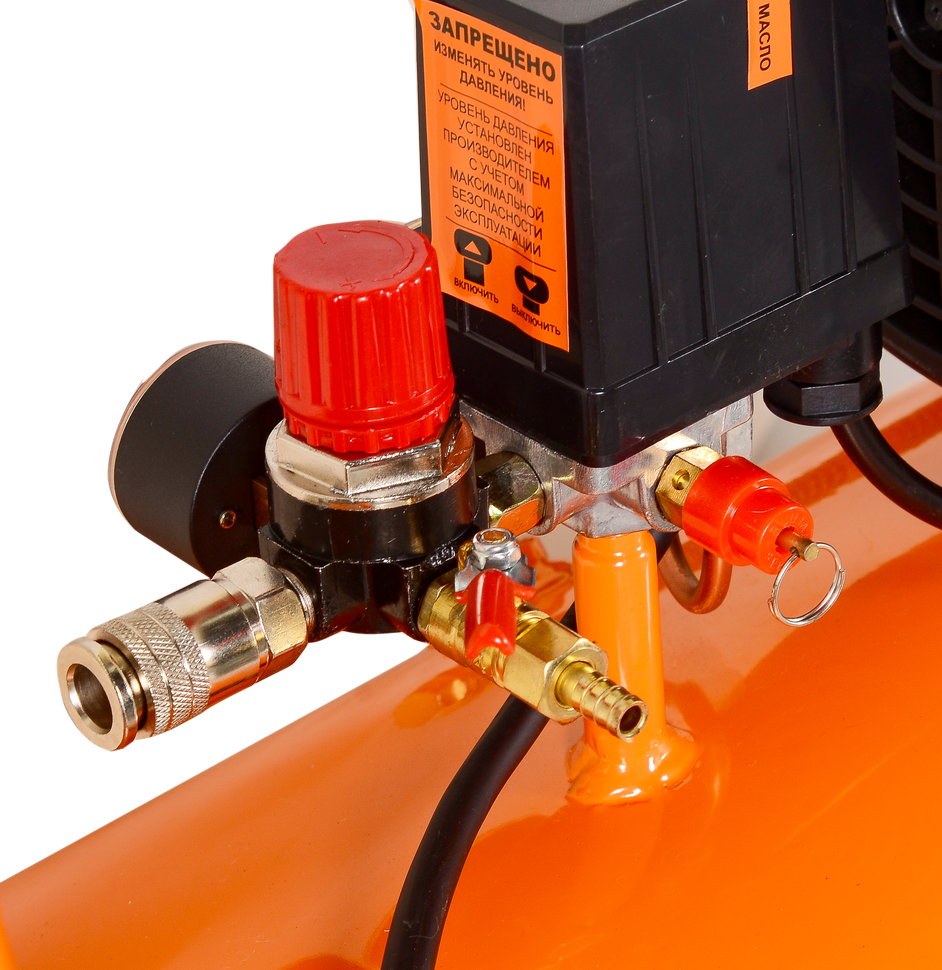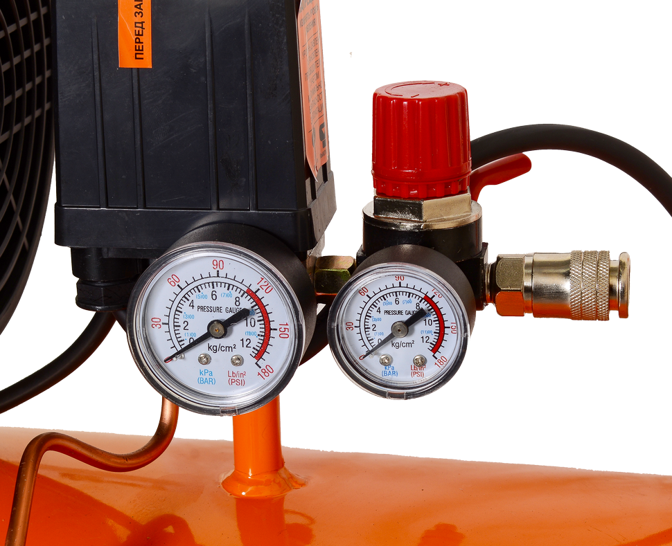 Входящий воздух проходит через фильтры и очищается от пыли и других примесей. Это продлевает срок эксплуатации двигателя. Регулятор задает уровень давления на выходе. Оно автоматически поддерживается прессостатом. Встроенные манометры позволяют контролировать работу автоматики. У двигателя масляный тип смазки. Смазочное масло и воздушные фильтры входят в комплекте поставки.