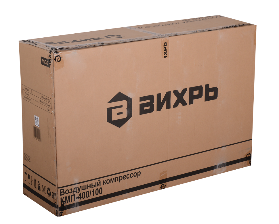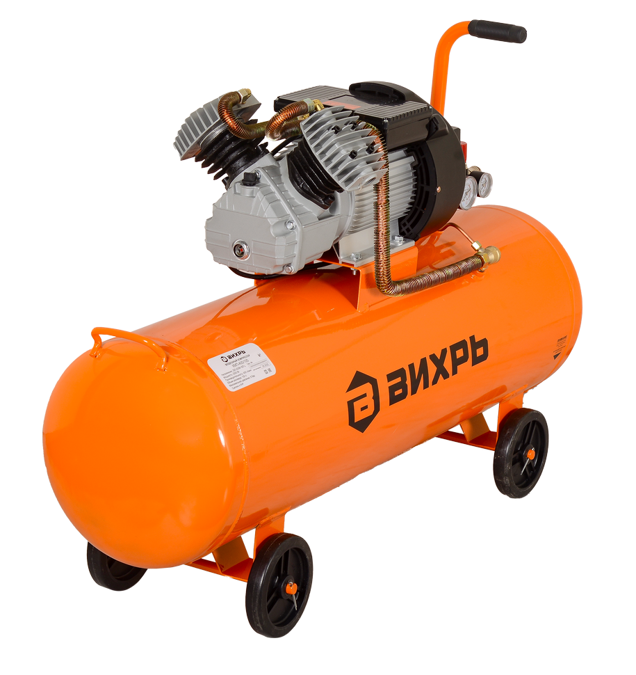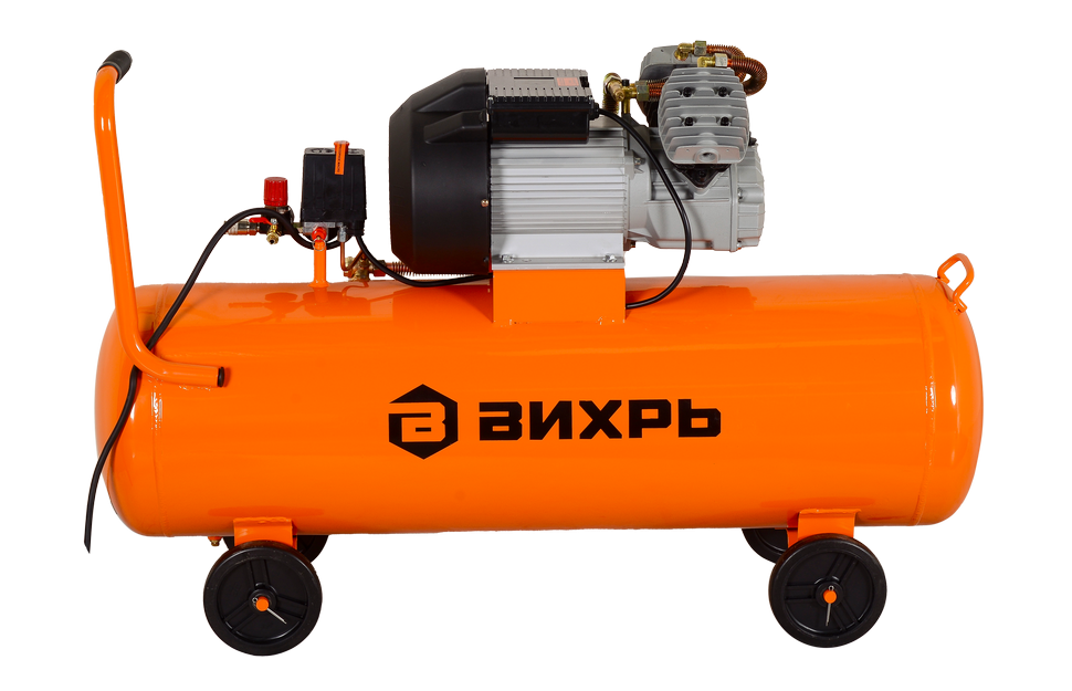 Компрессор Вихрь КМП-400/100 защищен от перегрева, КЗ и скачков напряжения в электросети. Для легкой транспортировки предусмотрена ручка и колеса.