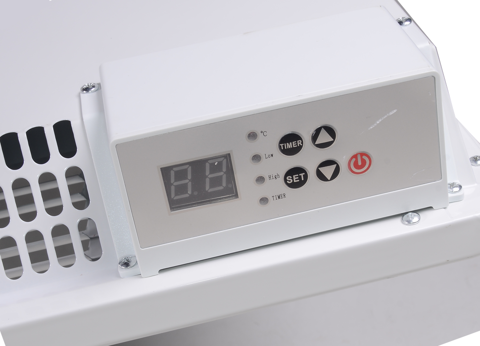 - В верхней части корпуса расположен LED-дисплей с панелью управления. Чувствительный термостат позволяет задавать и автоматически поддерживать уровень нагрева.