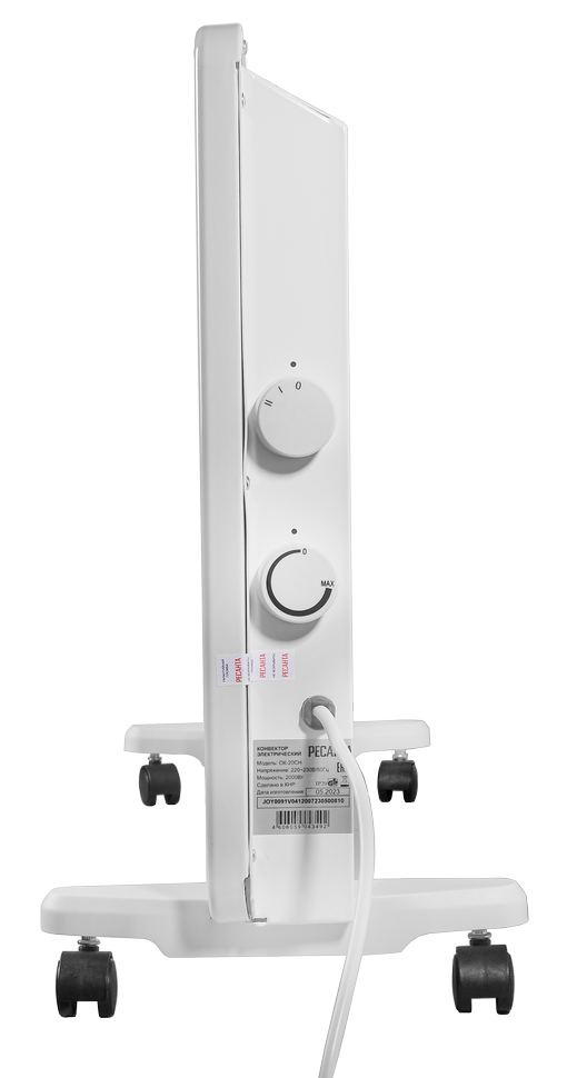 В конвекторе установлен стич-нагреватель мощностью 2 кВт. Ручка регулировки температуры включает обогреватель на половинную или полную мощность. Два режима работы позволяют настроить комфортную температуру воздуха. Термодатчик будет автоматически её поддерживать. Для безопасной эксплуатации в приборе предусмотрена защита от перегрева.