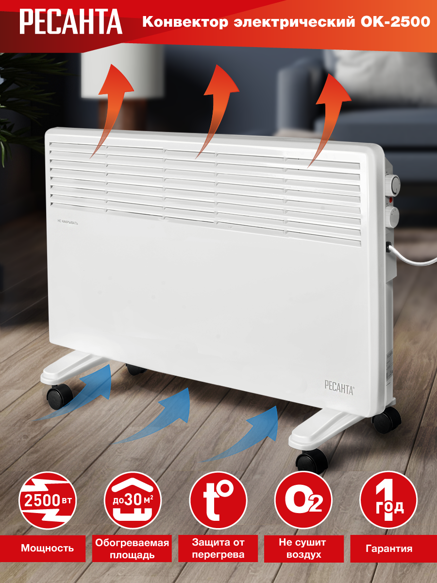 Электроконвектор Ресанта ОК-2500 – мощный прибор для обогрева помещений площадью до 30 м². Монолитный Х-образный нагревательный элемент обеспечивает подачу теплого воздуха сразу после включения, не сушит воздух и не сжигает кислород. Наличие двух режимов обогрева мощностью 1250 и 2500 Вт позволяет экономить электроэнергию при использовании прибора в больших и маленьких помещениях.