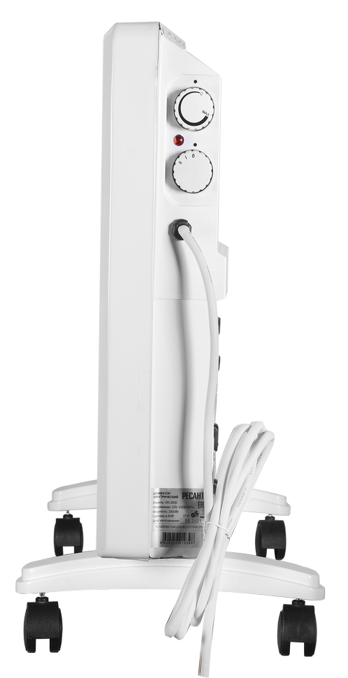 Электроконвектор Ресанта ОК-2500 имеет механический блок управления, расположенный на боковой стенке. Устойчивые опоры предотвращают опрокидывание. Наличие колес позволяет передвигать конвектор по горизонтальной поверхности. В комплектацию входят крепления для настенного монтажа. Световой индикатор включения позволяет контролировать работу конвектора. Металлический корпус устойчив к механическим повреждениям. Окрашенный в белый цвет, он гармонично сочетается с интерьером жилого или рабочего пространства.