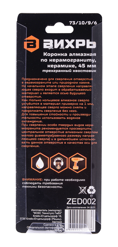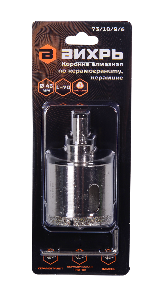 Коронка алмазная по керамограниту/керамике используется для резки отверстий диаметром 45 мм в керамических и керамогранитных плитах. Она имеет специальную конструкцию, которая позволяет ей легко прорезать материал без сколов и трещин. Может также использоваться для работы со стеклом.