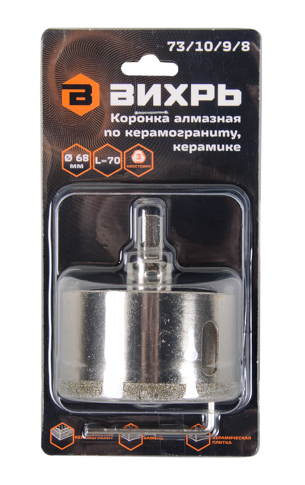 Коронка алмазная по керамограниту/керамике используется для резки отверстий диаметром 68 мм в керамических и керамогранитных плитах. Она имеет специальную конструкцию, которая позволяет ей легко прорезать материал без сколов и трещин. Может также использоваться для работы со стеклом.