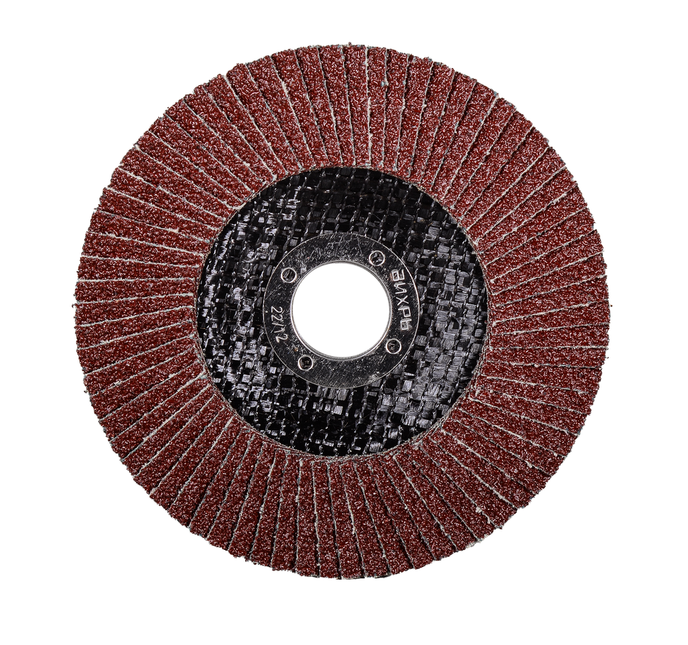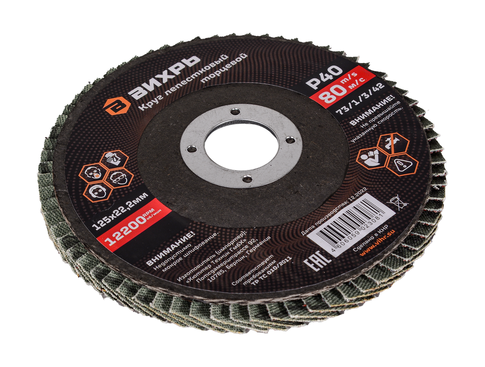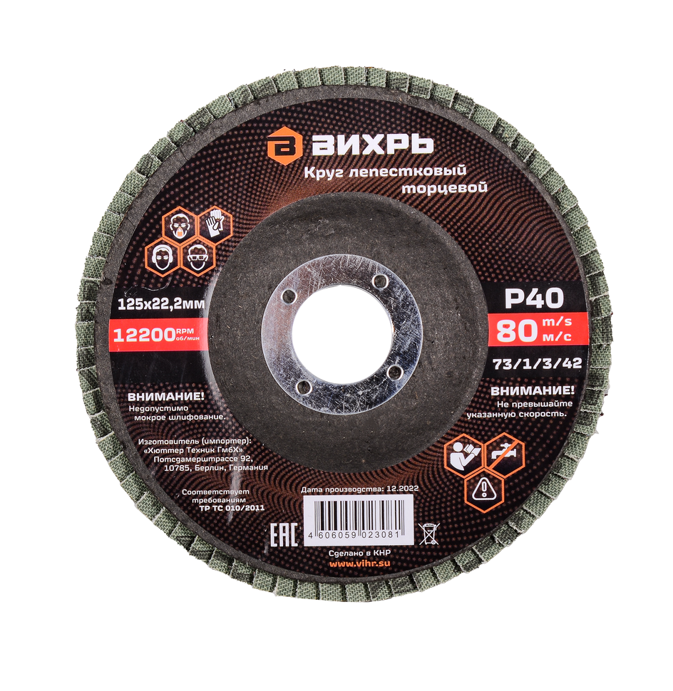 Круг лепестковый торцевой Вихрь 125х22,2 мм с зернистостью Р40, изготовлен из прямоугольных элементов шлифовальной шкурки на тканевой основе. Эти элементы расположены в виде веера на подложке из стекловолокна.