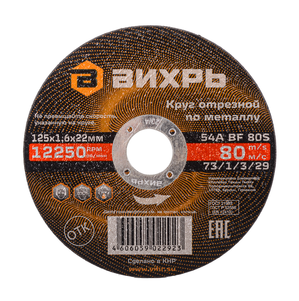 Круг отрезной по металлу ВИХРЬ 125х1,6х22 мм предназначен для использования в углошлифовальных машинах при резке таких материалов как сталь, чугун, нержавеющая сталь и другие.