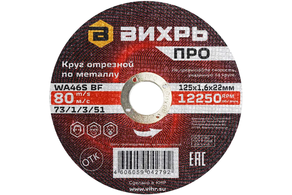 Отрезной круг имеет посадочный диаметр 22 мм и диаметр диска 125 мм. Толщина круга составляет 1,6 мм. Максимальная скорость: до 12 250 об/мин. Отрезной круг обеспечивает быструю и чистую резку металла без заусенцев и брака. Специальная конструкция круга обеспечивает надежное сцепление с инструментом и предотвращает разрушение диска. Отрезной круг ПРО имеет увеличенный рабочий ресурс и срок службы.